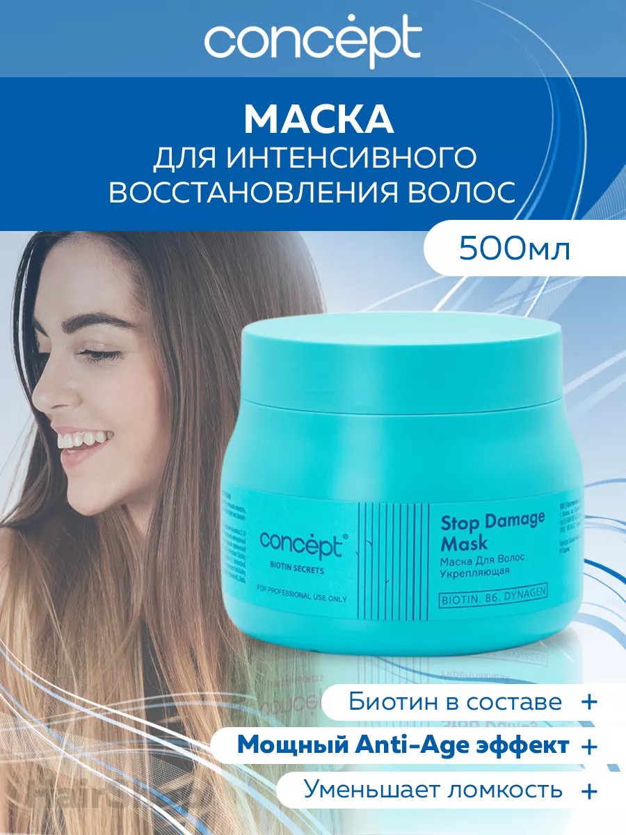 Маска для волос укрепляющая BIOTIN SECRETS Stop Damage Mask Концепт. Укрепляющая маска Biotin Secrets для волос разработана специально для оказания мощного Anti-Age эффекта – восстановления волосков с сединой и замедления процессов возрастных изменений. Динаген – делает волосы прочными, сильными, упругими и эластичными от корней до кончиков. Биотин – придает волосам плотность, реконструирует кератиновые структуры. Комплекс масел: Авокадо, Ши, Шиповника: защищает волосы от старения; возвращает волосам блеск и мягкость; интенсивно питает волосы по всей длине; разглаживает структуру волоса. Витамин PP: укрепляет волос; стимулирует рост волос; усиливает микроциркуляцию крови, улучшая питание фолликул; помогает удерживать влагу в структуре волос. В салоне используйте после шампуня Biotin Secrets для укрепления очень хрупких волос с сединой. Дома используйте после шампуня Biotin Secrets 1-2 раза в неделю. Маска для волос профессиональная с биотином - лучшее средство против выпадения волос, для избавления от секущихся кончиков волос и для разглаживания волос. Для сухих и повреж волос нужны усиленные профессиональные способы ухода для ежедневного применения. При длительном влиянии на волосы повреждающих факторов можно нанести на волосы несмываемый кондиционер, который будет сохранять здоровье волос. Укрепляющая маска для волос обеспечивает профессиональный уход для волос и обеспечивает защиту от выпадения волос, легкое расчесыв, защиту от УФ-лучей. Уход за волосами, сильно поврежденными из-за окрашивания, химических завивок, возрастных изменений, с помощью Concept маски обеспечивает увлажнение и питание, защита и восстановл для повреж волос в любом возрасте. Крем-маска возвращает эластичность волосам, убирает секущиеся кончики, придает блеск и гладкость для легкого расчесывания волос.
