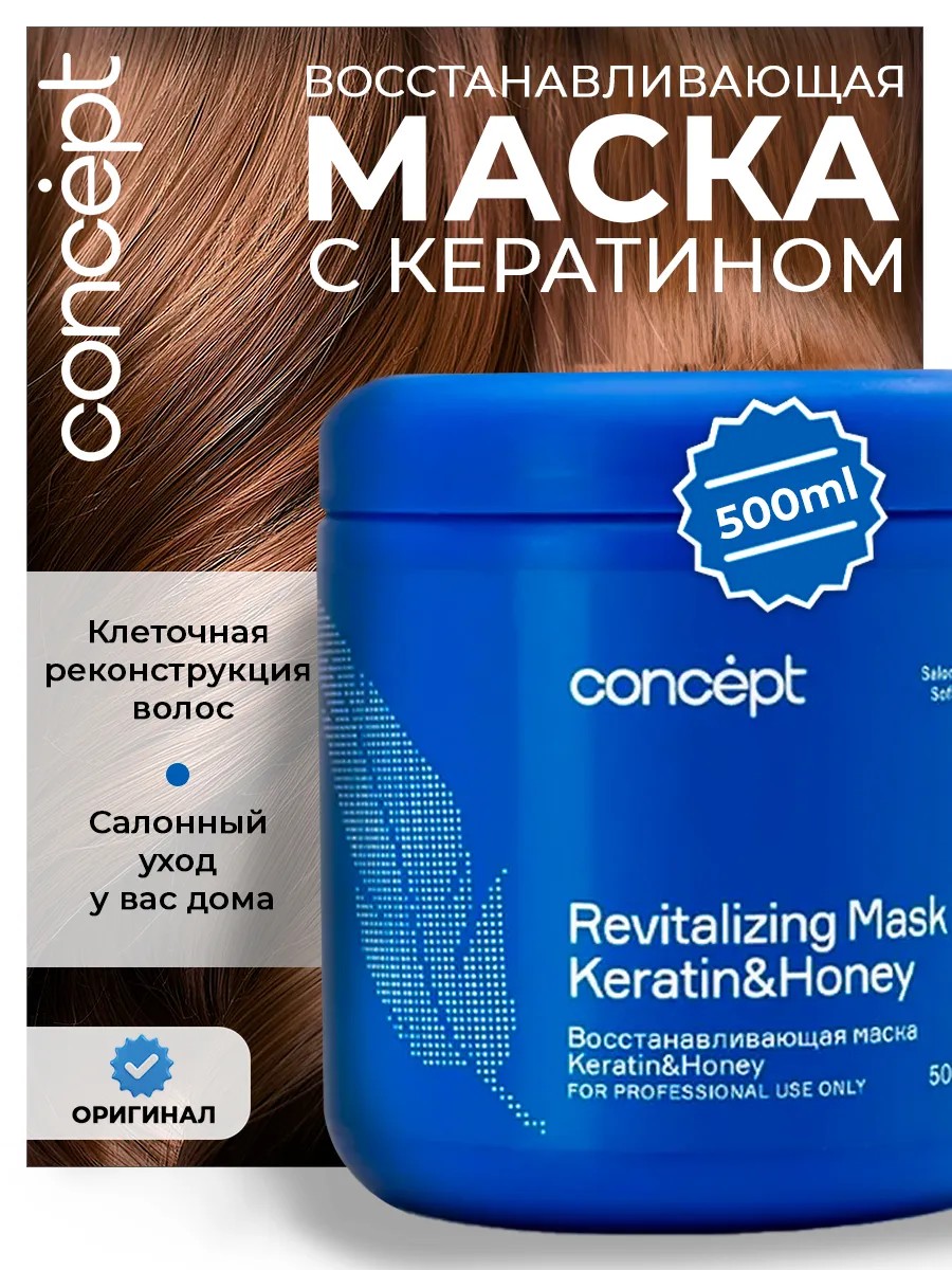 The Revitalizind Mask Keratin & Honey Soft Care restorative hair mask from Concept is just what your damaged hair needs. This moisturizing and nourishing keratin mask will easily restore your hair's structure, adding healthy shine and silkiness. Keratin penetrates deep into the hair structure and effectively reconstructs severely damaged cuticles. Flaxseed oil moisturizes and protects hair from dryness and brittleness. This keratin mask with a Botox effect is especially recommended for blondes whose hair often suffers from chemical coloring and bleaching procedures. The unique formula with a laminating effect will help prevent split ends and protect colored and bleached hair from the negative effects of the environment. The combination of keratin and oils makes this mask ideal for strengthening and restoring damaged hair. Apply the mask to clean, towel-dried hair and leave on for 10 minutes. To enhance the effect and ensure the best penetration of beneficial components into the hair structure, it is recommended to keep the product on the hair under the influence of additional heat (hair dryer or climazone) at a temperature of no more than 40°C.