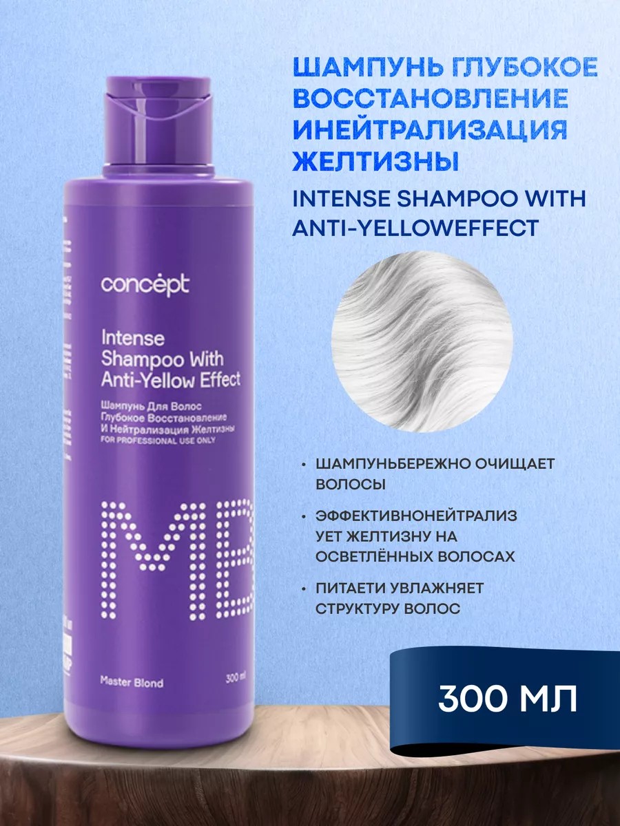 **Шампунь для волос Глубокое восстановление нейтрализация желтизны 300мл. Профессиональный Концепт** предназначен одновременно для интенсивного ухода и устранения нежелательной желтизны на осветленных волосах.Инновационный состав, в основе которого кератин, масло персика, экстракт алоэ-вера и d-пантенол обеспечивают восстановление структуры волоса, увлажнение и питание, наполняя волос изнутри. Волосы приобретают эластичность, плотность и блеск, в то время как фиолетовый пигмент эффективно борется с нежелательным желтым оттенком, неизбежно появляющимся с течением времени на осветленных волосах**Что говорят об Intense Shampoo With Anti-Yellow Effect?**-Бережно очищает волосы и кожу головы. Не требует дополнительных процедур ухода и восстановления. Удаляет желтизну.**Как используют Intense Shampoo With Anti-Yellow Effect?**Нанесите шампунь на влажные волосы. Массажными движениями равномерно распределите по волосам и коже головы. Промойте волосы теплой водой.