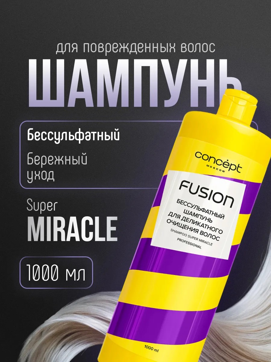Concept Fusion Super Miracle Шампунь для волос бессульфатный для деликатного очищения 1000мл. Бессульфатный шампунь консепт, разработанный специально для деликатного очищения повреждённых волос. Это профессиональное средство обеспечивает эффективное и бережное удаление загрязнений, пыли и остатков укладочных средств, не нарушая естественный баланс кожи головы.