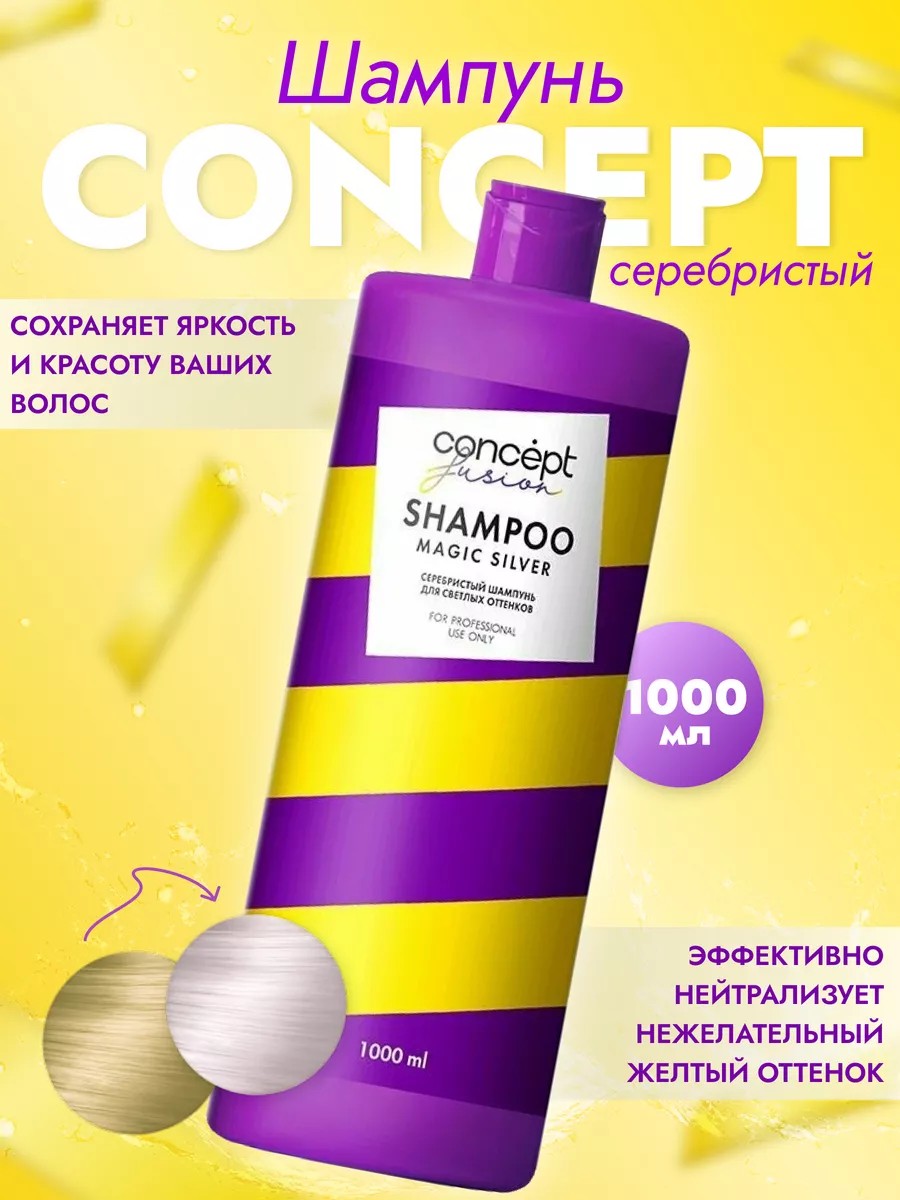 Concept Fusion Magic Silver is a specially formulated professional product that helps preserve the vibrancy and beauty of blonde hair. It effectively neutralizes brassiness on bleached and color-treated hair, helping you maintain a beautiful blonde at home. Concept Fusion Magic Silver purple shampoo has a unique formula that gives hair a unique cool shade. This silver shampoo eliminates brassiness thanks to the purple pigments in its formula. Its balanced formula gently cleanses, nourishes, and adds elasticity, silkiness, and shine. It is ideal for unruly, straight, curly, wavy, frizzy, and gray hair. It does not leave the scalp greasy or cause itching or dandruff. Suitable for home care for both men and women, as well as for professional use in beauty salons and hairdressers. HOW TO USE: Apply shampoo to damp hair and lather. After 5 minutes, rinse thoroughly with warm water. For a more intense shade, leave the color on for 10-15 minutes, then rinse thoroughly with warm water. Using gloves is recommended. Perfect as a gift for your wife, mother, friend, or girlfriend. A useful gift for birthdays, March 8th, February 14th, New Year's, and just because.
