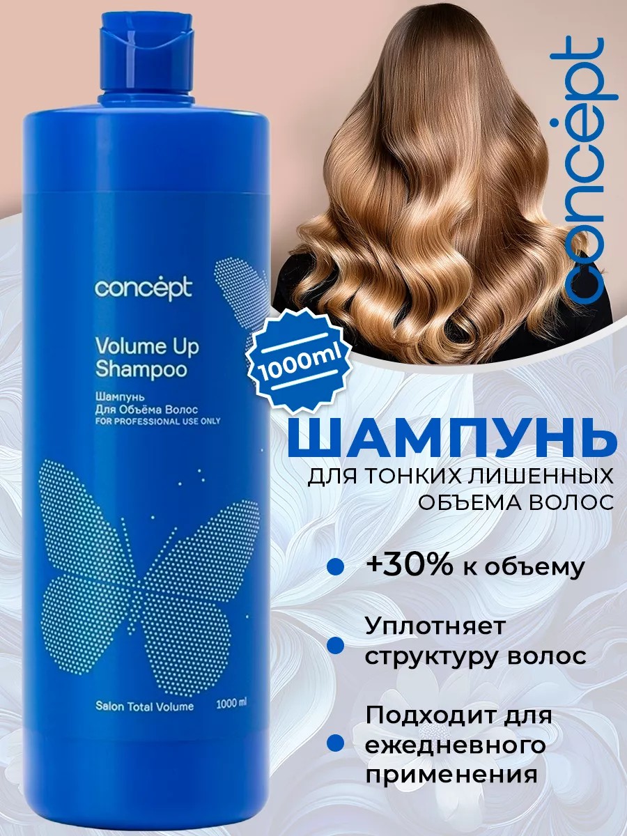 Concept Volume Up Shampoo for women (1000 ml (1 liter)) instantly lifts curls from the roots, giving hair a light, airy effect and root volume. A moisturizing complex of natural proteins penetrates the structure, gently enveloping, thickening and adding strength, lifting from the roots. This professional shampoo quickly and easily transforms into a light, airy foam, perfectly cleanses the scalp, removing residual lipids (sebum) and cosmetics. Hair instantly gains volume, lightness, and airiness. Vitamin-rich ginseng extract promotes strengthening, further growth, and restoration, adding radiant shine. Celandine extract improves scalp condition, reduces sebum production, and relieves itching. The unique composition of this perfumed shampoo provides natural protection and prevents the destruction of natural keratin. What do stylists say about Volume Up? Thickens the hair structure and thoroughly cleanses the length and scalp. Volume lasts until the next wash. Intended for: fine, volume-depleted hair. Suitable for all hair types, including oily, color-treated, bleached, highlighted, curly, frizzy, porous, and dry hair. This product eliminates excess frizz, ensures easy combing, and combats dandruff and split ends. Suitable for men and the whole family. Suitable for professional use by hairdressers in salons and at home.