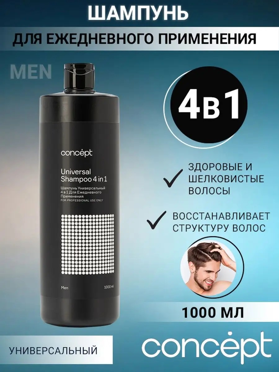 Шампунь универсальный профессиональный для волос Сoncept 1000 мл. для ежедневного применения идеальный комплексный мужской уход. Уход за волосами, Уход за бородой, Гель для душа, кондиционер для волос. Мягко и бережно очищает, легко смывается, оставляя приятное ощущение свежести. Экстракт бергамота нормализует активность сальных желез. Экстракты мяты и имбиря обладают тонизирующим эффектом, укрепляют волосы и предотвращают их ломкость. Комплекс из эстрагона и экстрактов зеленого и белого чая питает, увлажняет, успокаивает кожу. Подходит для ежедневного применения. Способ применения: нанесите небольшое количество шампуня на влажные волосы, кожу головы, бороду и тело. Аккуратно вспеньте массирующими движениями и тщательно смойте. При необходимости повторите процедуру.Универсальный шампунь Концепт 4 в 1 предназначен для очищения и комплексного ухода за волосами и кожей головы мужчин.Рецептура шампуня, основанная на натуральных компонентах позволяет комплексно воздействовать на причины дискомфорта: Экстракт бергамота нормализует активность сальных желез, обладает противовоспалительным действием. Экстракт мяты обладает успокаивающим эффектом, питает и укрепляет слабые волосяные луковицы волос. Экстракт имбиря тонизирует и стимулирует кровообращение кожи, стимулирует рост волос. Комплекс из эстрагона и экстрактов зеленого и белого чая питает, увлажняет, успокаивает кожу. Экстракт мелиссы укрепляет и питает волосы, увлажняет и обладает противовоспалительным действием.D-пантенол обладает увлажняющими и разглаживающими свойствами, защищает от негативных воздействий окружающей средыЧто говорят мастера об профессиональном универсальном шампуне 4 в 1. Универсальный продукт, многофункциональность.Клиенты ценят ощущение чистоты и комфорта.Большой флакон для салона и маленький, чтобы рекомендовать клиенту.Как используют универсальный шампунь 4 в 1. Нанесите шампунь на влажные волосы. Вспеньте. Массажными движениями равномерно распределите по волосам и коже головы. Промойте волосы теплой водой.