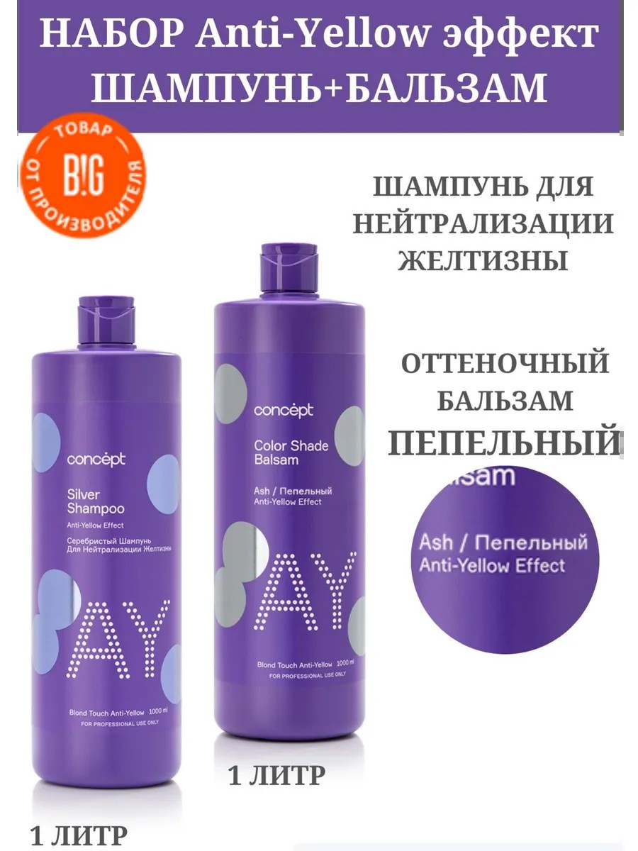 Набор для светлых волос, для ухода за окрашенными волосами. Идеальная формула поддержания роскошного блонда после осветления волос: Профессиональный оттеночный шампунь 1000мл (1 литр )+ Оттеночный бальзам для нейтрализации желтизны Anti-Yellow 1000 мл ( 1л )Concept (Концепт). Уникальная формула шампуня нейтрализует нежелательный жёлтый цвет, который проявляется на волосах спустя несколько недель после осветления или мелирования. Пигменты, входящие в состав бальзама (Пепельный блонд Арктический блонд Жемчужный блонд Карамельный блонд) усиливают эффект нейтрализации желтизны и придает волосам легкий оттенок. Сбалансированный комплекс кондиционеров и биологически активных компонентов, входящий в состав бальзама, делают волосы блестящими и шелковистыми, создавая профессиональный уход у вас дома. Профессиональный антижелтый шампунь женский концепт очищает, создает эффект мерцания и чистых сияющих бликов, добавляет яркости окрашенным, осветленным и натуральным волосам, оживляя притягательный, дымчатый, холодный цвет. Женский шампунь для волос подходит для светлых, блондированных, мелированных и седых волос любой текстуры: вьющихся, кудрявых, прямых, волнистых. Профессиональный женский шампунь нейтрализатор желтизны для блондинок бережно очищает осветленные волосы (блонд), помогает сохранить благородный холодный оттенок локонов, получить невероятно притягательный блонд серебристых тонов. У тонирующего антижелтого шампуня против желтизны густая кремовая консистенция с приятным, ненавязчивым ароматом. Кератин в составе шампуня против желтизны восстанавливает, защищает поврежденные пористые волосы, возвращая им естественные сияние и гладкость. Бальзам concept подходит для всех типов волос. Данный товар отлично подойдет как подарок на любой праздник любимой Наш товар это необычный подарок для поздравления с днем рождения близких и любимых! Шампуни и кондиционеры от концепт бережно очищают волосы и ухаживают за ними.