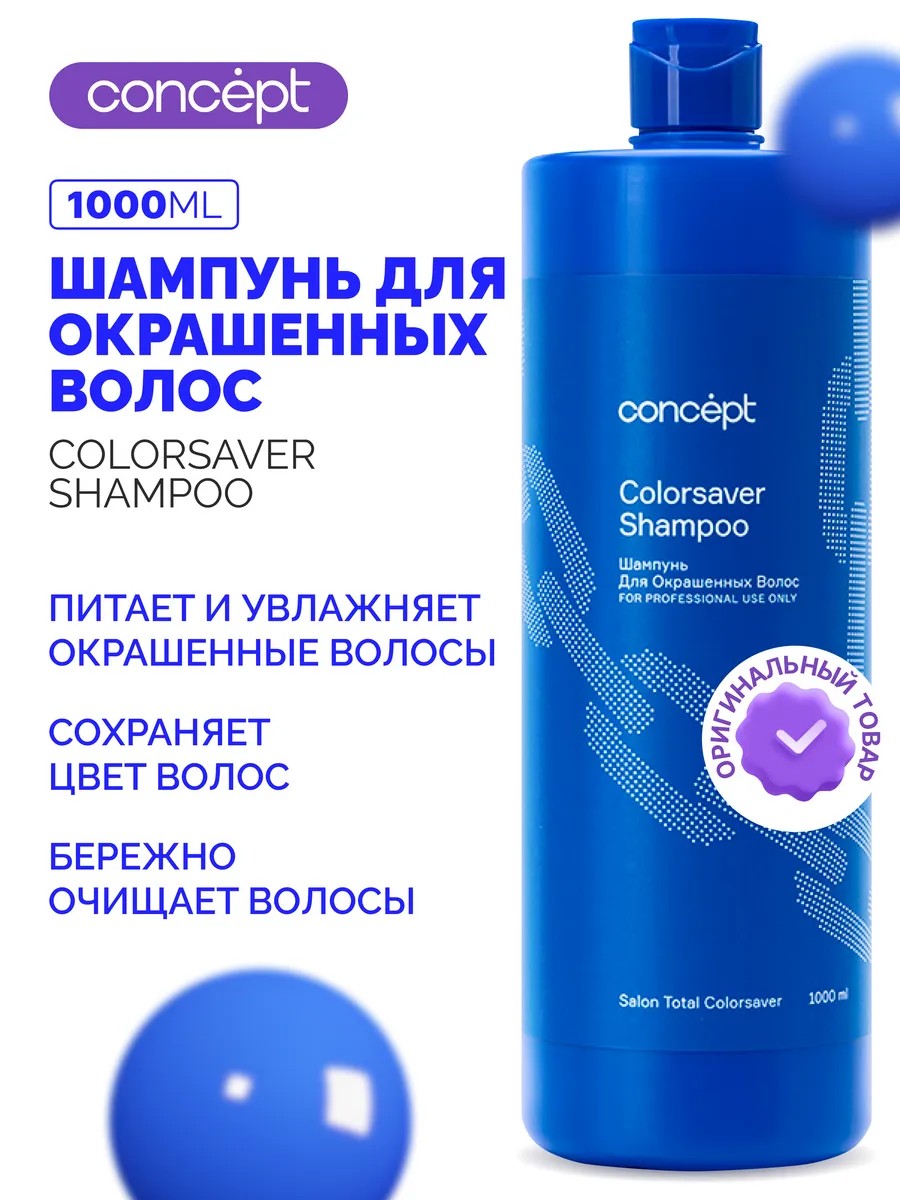 Concept Colorsaver Salon Total Professional Shampoo, 1000ml (1 liter), protects color and cares for hair. Its advantages: gently cleanses without drying the scalp. Enhances color vibrancy. An innovative complex fixes dye molecules and prevents color fading. Moisturizing ingredients combined with citrus extracts gently smooth the hair cuticle, soften and prevent dry ends. A combination of natural goji berry extract with vitamin PP and a keratin complex nourishes the hair structure, fills it with valuable microelements, gives hair strength and density. It enhances hair shine and protects against fading. Prevents oxidative destruction of color molecules and guarantees maximum color protection between colorings. Protects color from fading, oxidation, hair loss, and fading in the sun. This cosmetic product will provide care for curly, frizzy, and oily hair. ColorLUX Complex: Fixes dye molecules. Makes hair color more vibrant and radiant. Nourishes and moisturizes color-treated hair. Directions: Colorsaver Shampoo: Apply shampoo to damp hair. Massage evenly into hair and scalp. Rinse with warm water. Gently pat hair dry with a towel.