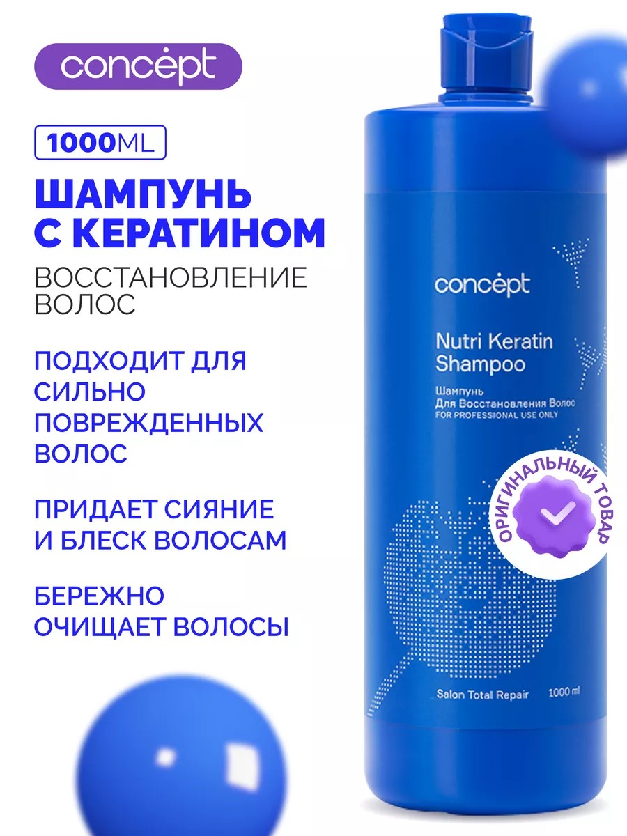 Шампунь для восстановления волос женский Concept (Концепт Консепт) Salon Total Repair Nutri Keratin Shampoo. Профессиональный шампунь на основе комплекса Nutri Keratin предназначен для восстановления, укрепления интенсивного ухода за ломкими, секущимися и хрупкими волосами. Он деликатно очищает, бережно заботясь о поврежденных волосах и их выпадения. Благодаря высокой концентрации кератина, восстанавливаются поврежденные участки и эффективно реконструируются даже сильно поврежденные волосы. Масло арганы насыщает волосы питательными веществами, укрепляет, делает волосы мягкими и послушными, препятствует их ломкости. D-пантенол создает дополнительную защиту для предотвращения повреждений и ломкости, увлажняет и возвращает эластичность.Подходит для профилактики сечения кончиков, помогает усилить гладкость и сияющий блеск волос.Регулярное использование восстанавливающего средства обеспечит полноценный уход окрашенным волосам и продлит жизнь цвету. Косметическое средство обеспечит уход для кудрявых и вьющихся, жирных волос. Защищает цвет от вымывания, окисления, против выпадения и выгорания на солнце. Питает и увлажняет окрашенные волосы.Придает волосам прочность и плотность; оказывает антиоксидантное действие; стимулирует рост волос, защищает от внешних воздействий; питает, восстанавливает структуру.Шампунь для волос профессиональный отлично очищает волосы и кожу головы от загрязнений питая,увлажняя и восстанавливая структуру волоса.Шампунь с кератином отлично справляется с сухостью и тусклым видом ваших волос, делая их послушными, эластичными и блестящими.Шампунь для сухих волос отлично увлажнит ваши волосы от корней до самых кончиков, не утежеляя их. Способ применения: нанесите шампунь на влажные волосы.Массажными движениями равномерно распределите по волосам и коже головы.Шампунь быстро и легко преобразуется в легкую воздушную пену, отлично очищает волосы и кожу головы, избавляет ее от остатков липидов (себума) и косметических средств.Промойте волосы теплой водой.
