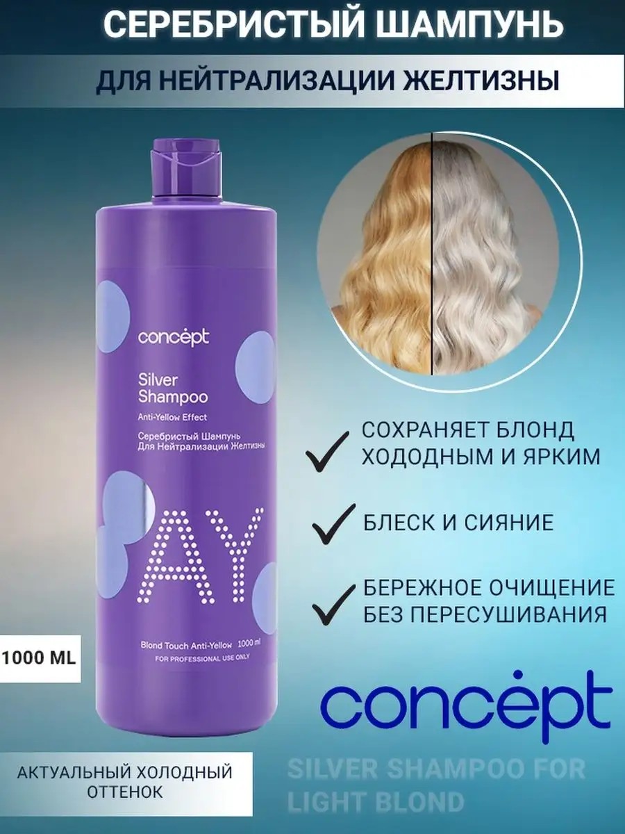 Серебристый оттеночный шампунь уход для волос Concept. Объем 300 мл. и 1000 мл. Настоящий салонный уход за осветленными и светлыми волосами предлагает марка Concept. Оттеночный шампунь для волос Concept, это идеальное средство для светлых или осветленных волос. Удобное и легкое для нюансирования осветленных волос. Пигменты, входящие в состав оттеночного шампуня для волос Концепт, придают свежесть,сияние и красоту оттенкам блонд, нейтрализуют нежелательный желтый оттенок на осветленных и окрашенных в светлые тона волосах. Мягкие ПАВы в средстве , получаемые из плодов кокоса, и эффективные кондиционирующие добавки обеспечивают необходимое увлажнение, питание и защиту волосам, в результате они становятся блестящими, мягкими и эластичными, легко ложатся в прическу. Шампунь для волос Серебристый Concept лучший выбор по отзывам клиентов. Бренд Концепт предлагает наилучшее сочетание шампунь цена-качество.