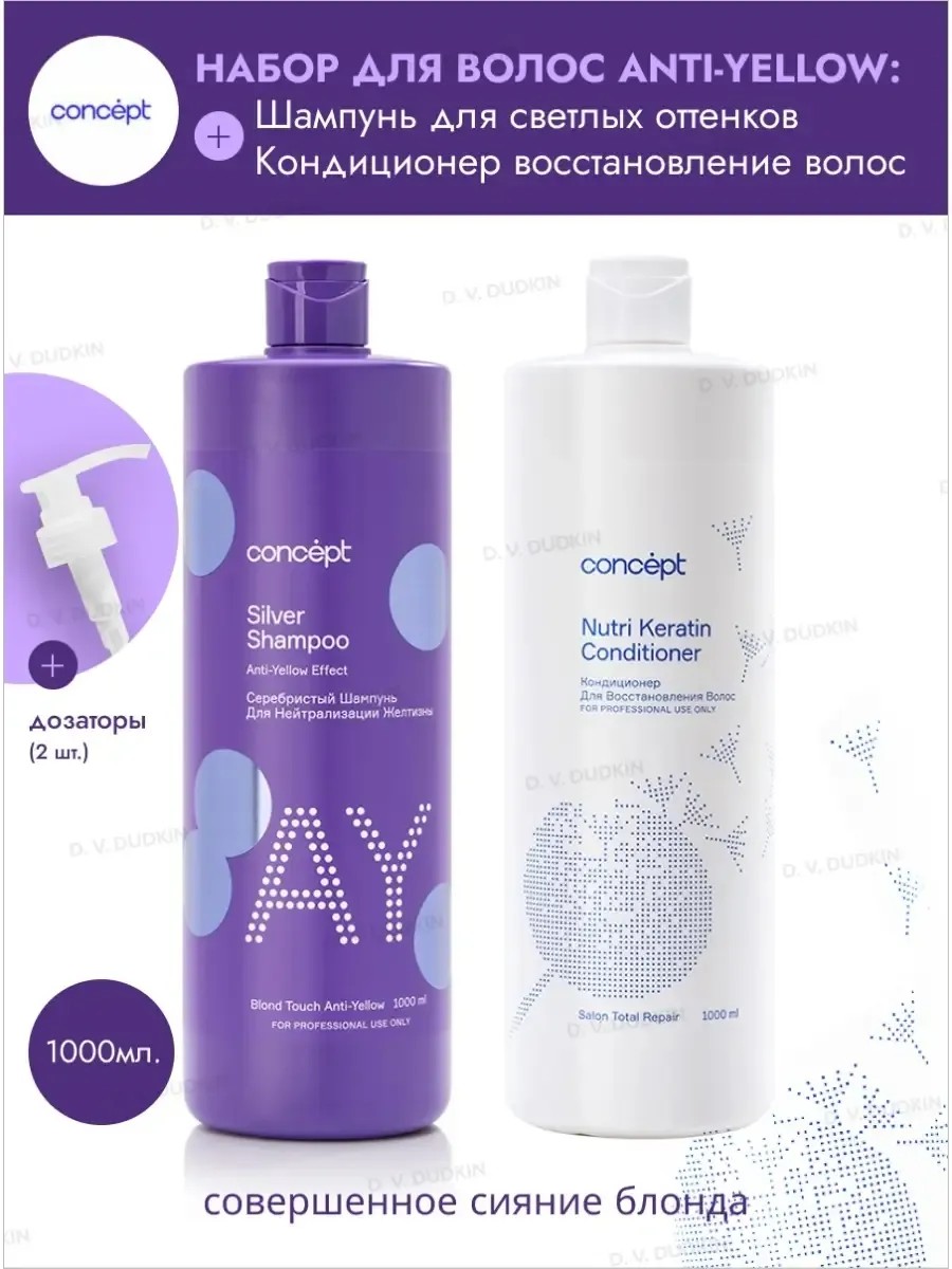 | Package contents | Dispensers - 2 pcs.; Silver shampoo for neutralizing yellowness Anti-Yellow, 1000 ml - 1 pc.; Conditioner for hair restoration 1000 ml - 1 pc. |