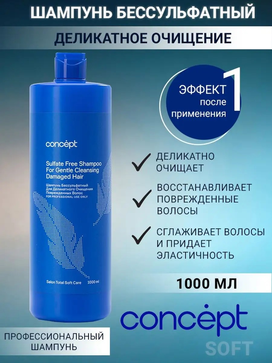 Concept Sulfate-Free Shampoo, a professional shampoo for cleansing hair and scalp with nutrients, is a unique, sulfate-free cosmetic product that meets all modern requirements for natural hair care. Available in 1000 ml and 300 ml bottles. Concept's balanced formula, based on a complex of seaweed, lactic acid, and Vitamin PP, gently cleanses the hair and scalp of chemicals and dust, and neutralizes impurities and toxins. Aloe extract normalizes sebum secretion and moisturizes the hair, preventing moisture loss; D-panthenol regenerates the scalp and promotes hair growth. The unique composition of the seaweed complex effectively draws and neutralizes impurities and toxins from the hair, while gently enveloping it in a natural biofilm. Keratin complex with Vitamin PP fills damaged hair structure, forms a protective barrier against negative environmental influences, smooths the cuticle, prevents breakage and dryness, and restores flexibility, shine, and freshness to hair.