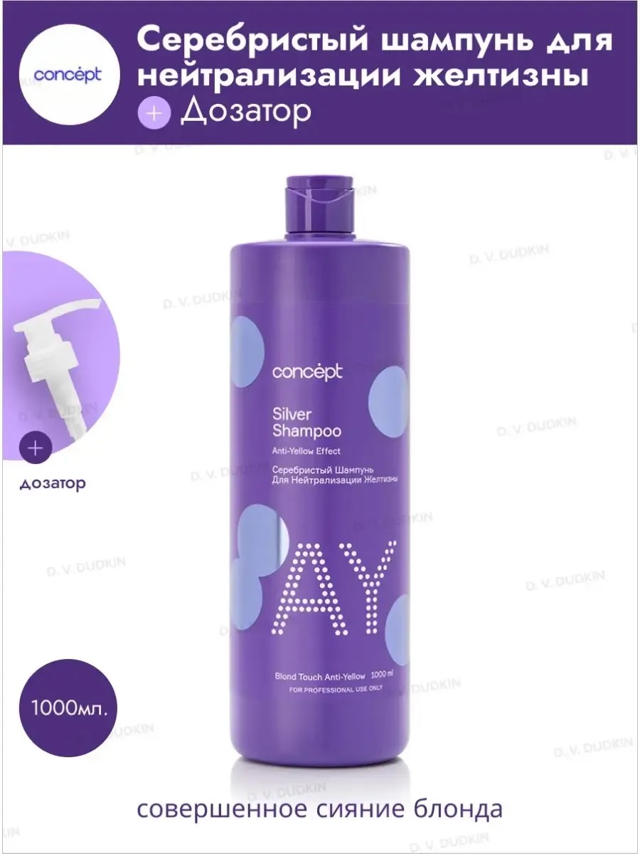 Профессиональный Серебристый шампунь концепт женский Concept Anti-Yellow для светлых оттенков придает свежесть и сияние оттенкам блонд, работает против неровного тона и прекрасно ухаживает за окрашенными и мелированными , поддерживая пепельные и платиновые переливы в период между окрашиваниями. Преимущества антижелтой краски Anti-Yellow в том, что он с первого применения убирает желтый оттенок с помощью фиолетового пигмента. Натуральное синее тонирующее средство для ухода подойдет для сухих, жирных, мелированных, седых кудрявых и вьющихся локонов. Обеспечивает глубокую очистку, восстановление локонов. Оттеночный нейтрализатор желтизны обеспечивает здоровье кудрей и кожи головы, легкое расчесывание и рост, без секущихся тонких и ломких кончиков и выпадения. Сиреневая тонировка подходит людям с чувствительной кожей головы, выпадением волос, страдающим от перхоти. Большой объем 1000 мл (1 литр) обеспечит экономичный расход. Данный товар отлично подойдет как подарок на любой праздник. Ведь подарки просто так всегда поднимают настроение! Наш товар это необычный подарок для поздравления с днем рождения близких и любимых! Добавляйте наш бренд в избранное и получайте уведомления о хороших распродажах и скидках.
