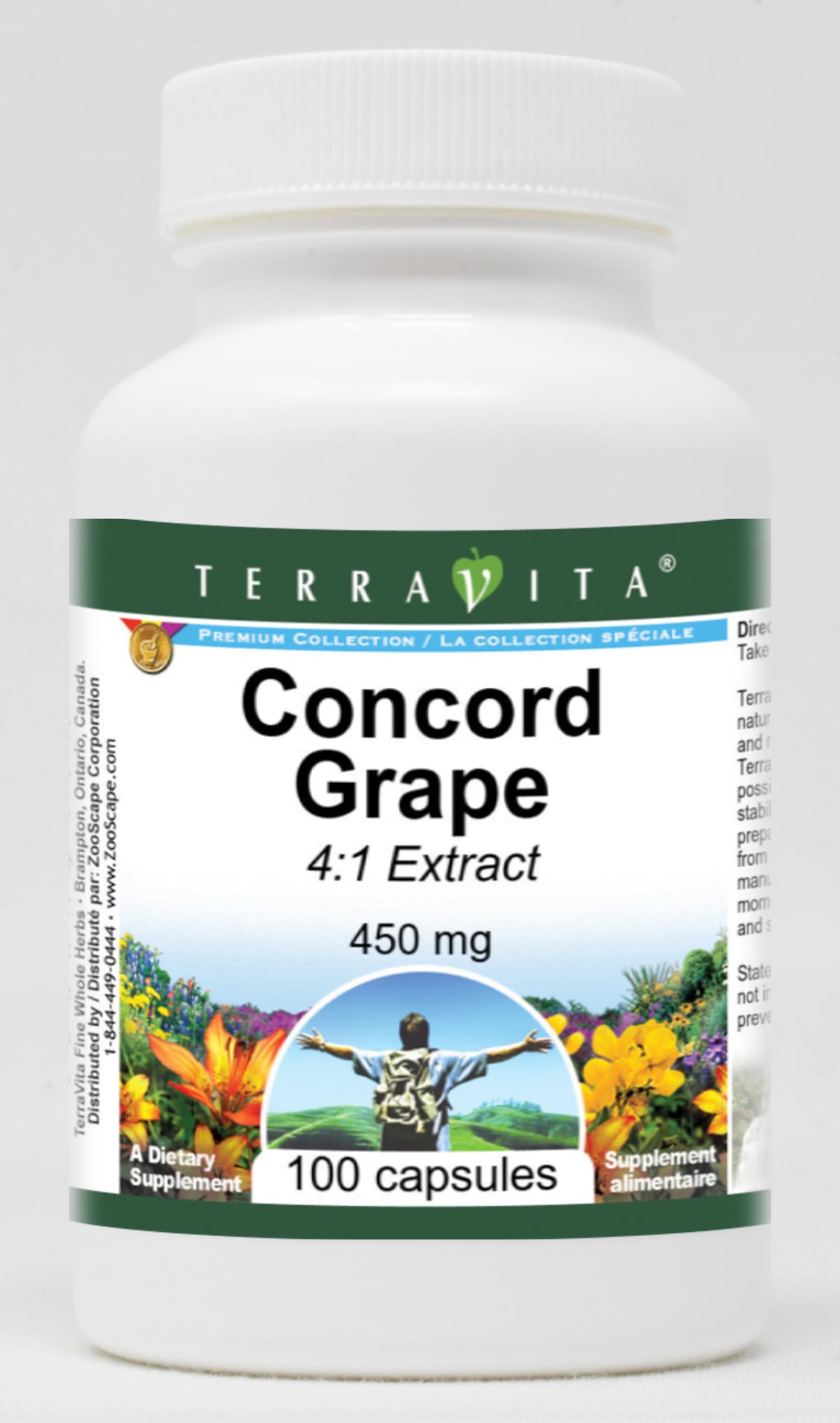 Concord Grape 4:1 - 450 mg (100 capsules, ZIN: 520322) Packaged in the United States in a GMP certified facility (Good Manufacturing Practice). No fillers. Manufacturer: TerraVita Size: 100 capsules Easy-to-swallow Capsules in a sealed bottle. Ingredients: Gelatin, Water, Concord Grape 4:1 Extract - 450 mg