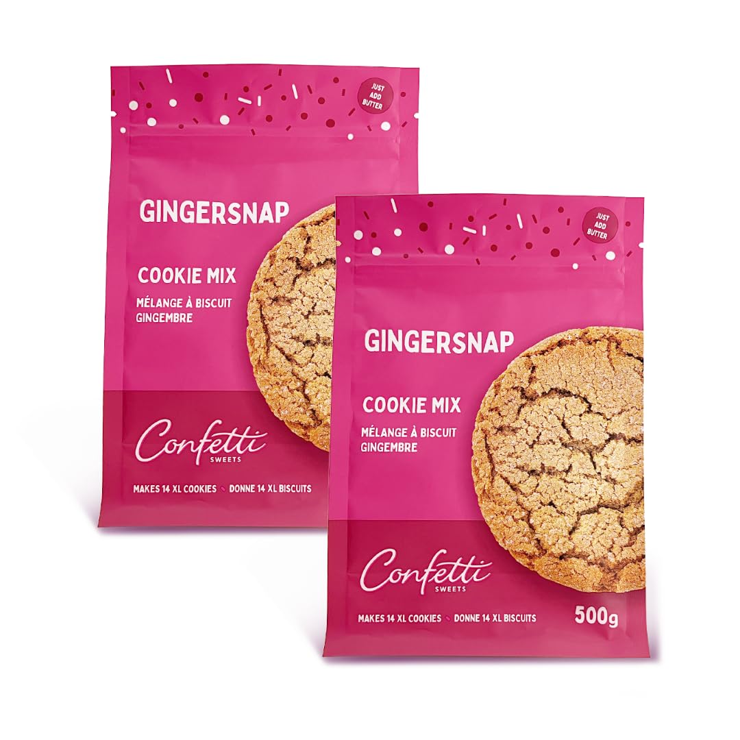 TOTALLY AWESOME COOKIES. Experience the warmth of our freshly baked cookies right from home! Our gingersnap cookie mix is a classic gingersnap that is bursting with a fragrant spice blend. This cookie is so soft and delicious, it makes for a perfect treat any time of the year! We use quality ingredients in all of our mixes, and we don't skimp. We use traditional baking ingredients, like molasses, ground cinnamon and ground cloves. Our other flavors use chocolate chunk and dried coconut. We don't add any preservatives to our cookies and we aim for a clean label. When we say Totally Awesome, we mean totally! Confetti Sweets was started by a stay-at-home mom making cookies and selling them at her local farmers market. Who knew it would one day turn into a cookie empire! Customers could not get enough of her chewy cookies that were crisp on the outside, and oh so soft on the inside. We now offer cookie mixes that taste just like they were made from scratch! It's our pleasure to bring the smells and tastes of our fresh baked cookies into the homes of Canadians all over the country!100 Made in Canada. Our cookie mixes are totally Canadian, made locally in Sherwood Park, Alberta. It's our pleasure to bring our fresh baked cookies into the homes of Canadians all over the country. We make customer satisfaction a priority and use quality ingredients. Our gingersnap is authentic and we use natural vanilla flavor. Our other mixes use chocolate chunks, not chips, and dried coconut. No added preservatives in all our cookie dough mixes. We aim for a clean label and use traditional baking ingredients such as molasses, dried whole egg, sugar, salt, ground cinnamon and ground cloves!. Soft chewy texture. Crisp on the outside and soft on the inside! Enjoy the warmth of freshly baked delicious, gourmet cookies in your home. A delightful cookie experience for all ages!. 2 pack of 500g each. Each mix bakes 14 extra large gingersnap cookies. Our gingerbread cookie mix is a classic gingersnap that is bursting with a fragrant spice blend. Great for gifts or gatherings.