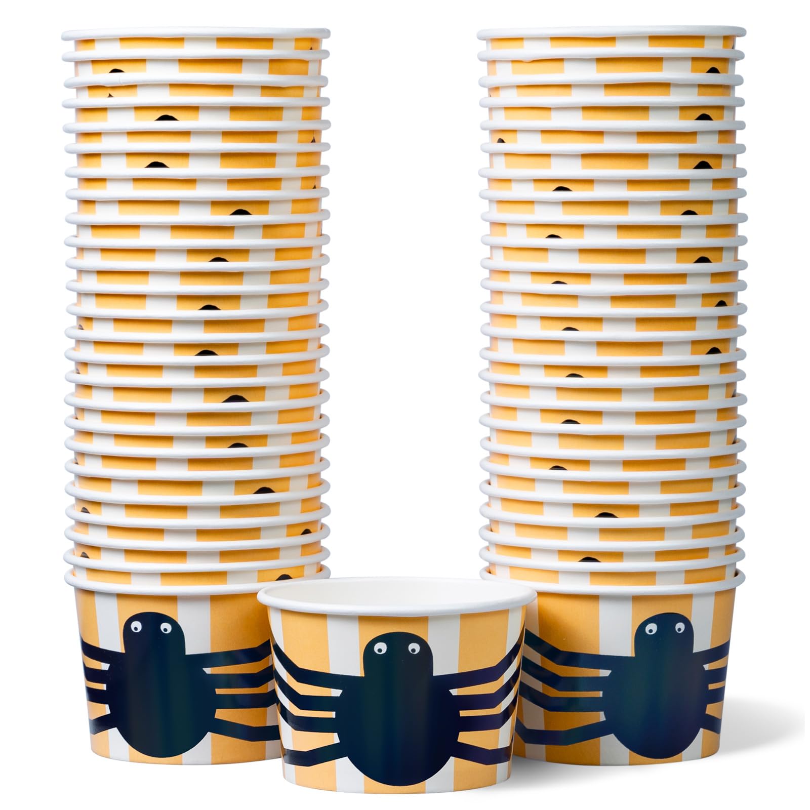 Serve various hot or cold treats with our Paper Ice Cream Cups. Designed for ice cream shops, concession stands, diners, restaurants, and bakeries, this versatile paper bowl is perfect for serving ice cream, frozen yogurt, chili, clam chowder, and other menu favorites. Its capacity allows users to easily pile on toppings or add an extra scoop of ice cream! These cups are made of a sturdy paperboard material to ensure it retains their shape. In addition, the cup's interior and exterior feature a polyethylene coating for outstanding leak resistance to prevent condensation from weakening the paperboard. Plus, it is disposable for easy cleanup after use. This set of paper dessert cups is great for more than just ice cream, sundaes, or frozen yogurt. Serve up just about anything from candy cups, corn in a cup, microwave cake, and even cereal! We are dedicated to providing you with quality party supplies and serving solutions at the best possible prices. Explore our vast collection of paper ice cream cups in various sizes, colors, and designs for your every need!Measurements: Cup opening measures 3.45 inches in diameter, cup base is 2.85 inches in diameter, and cup height is 2.32 inches. 9 Oz Capacity: Holds a scoop of your favorite flavor with room to pile on toppings. Serves Hot and Cold Food: Great for holding ice-cream sundaes, froyo, gelato, and other frozen treats, as well as serving hot items like chili, macaroni, and soup. Leak-Resistant Construction: Cups are made of a sturdy paperboard with a polyethylene coating on the interior and exterior for outstanding leak resistance and to prevent condensation from weakening the paperboard. Bulk Paper Ice Cream Cups: Set includes 50 single-serve paper dessert bowls with a spooky metallic spider design on white and orange stripes. Designed for ice cream shops, concession stands, caterers, and restaurants. Suitable for serving large events, kids' birthday parties, baby showers, and gatherings.