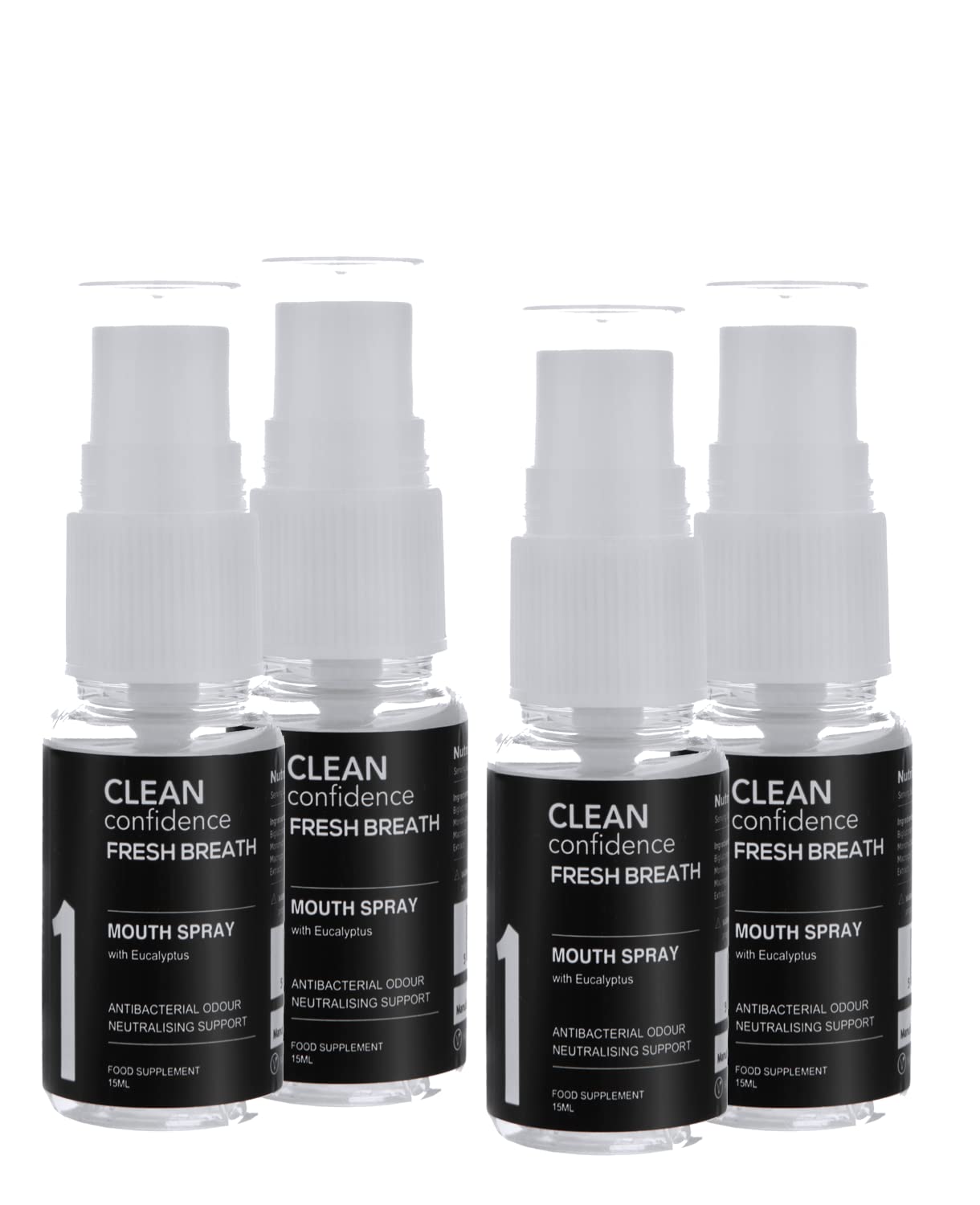 Clean Confidence Fresh Breath Antibacterial Mouth Spray with Eucalyptus Flavor is the perfect product to have on hand when you want to make a good impression with excellent oral hygiene. It comes in a pack of four 15ml bottles. Clean Confidence Fresh Breath Mouth Spray is formulated to quickly freshen breath while promoting oral hygiene with a powerful antibacterial action that helps eliminate odor-causing bacteria in the mouth. Clean Confidence Fresh Breath Mouth Spray differs in effectiveness from other similar products because the main function of its key ingredients is not simply to mask bad breath. Our ingredients have been specially formulated to target odor-causing bacteria and eliminate them quickly, neutralizing bad breath on impact while providing a powerful, long-lasting effect of a clean environment free from the source of bad breath. The compact and convenient 15ml spray bottle, only 8cm tall, can be stored absolutely anywhere: in your front pocket, back pocket, breast pocket, bag, purse, wallet—you name it. No matter the size or space, it fits without any hassle. It comes with a secure spray cap that makes leaks impossible, so it's always ready and at your fingertips. Just two or three sprays directly into your mouth instantly freshen your breath in an intimate setting or any situation where you want to make a good first impression, every time, and where bad breath simply isn't an option. This product is intended for use on an ad-hoc basis in conjunction with other organic products from our Clean Confidence Fresh Breath range, which supports sustainable oral hygiene and health and includes Clean Confidence Fresh Breath capsules. This product is not a medicine. Directions for use: Use daily as needed with 2 to 3 sprays directly into the mouth. Main ingredients: purified water, citric acid, glycerol, eucalyptus extractClean Confidence FREASH Lot de 4 flacons de 15 ml avec eucalyptusDESCRIPTION DU PRODUIT Le spray buccal antibactérien Clean Confidence Fresh Haleine neutralisant les odeurs avec saveur d'eucalyptus est le produit parfait à avoir à portée de main quand vous voulez faire la bonne impression d'une bonne hygiène bucco-dentaire. Il se compose d'un lot de quatre bouteilles de 15 ml. Le spray buccal Clean Confidence Fresh Breath est formulé pour rafraîchir rapidement l'haleine tout en favorisant l'hygiène buccale avec une action antibactérienne puissante qui favorise l'élimination des bactéries responsables des odeurs dans la cavité buccale. Le spray buccal Clean Confidence Fresh Breath diffère en efficacité des autres produits similaires car la fonction principale des ingrédients clés est de ne pas simplement masquer la mauvaise haleine. Nos ingrédients ont été spécialement formulés pour cibler les bactéries responsables des odeurs et les éliminer rapidement, afin de neutraliser la mauvaise haleine lors de l'impact tout en ayant un puissant effet durable d'un environnement propre vide de la source de mauvaise haleine. Le flacon pulvérisateur compact et pratique de 15 ml, seulement 8 cm de haut, peut être rangé absolument n'importe où, dans votre poche avant, poche arrière, poche de poitrine, sac, sac à main, portefeuille, vous le nommez, peu importe la taille ou la taille de l'espace, il peut y aller sans tracas. Il est livré avec un bouchon de pulvérisation sécurisé qui rend les fuites une impossibilité qu'il est toujours prêt, toujours à portée de main avec seulement deux à trois pulvérisations directement dans votre bouche pour apporter immédiatement de la fraîcheur à votre haleine dans un espace intime ou une situation où vous voulez faire bonne impression la première fois et à chaque fois, et où la mauvaise haleine n'est tout simplement pas une option. Ce produit est destiné à être utilisé sur une base ad-hoc en conjonction avec d'autres produits biologiques de notre gamme Clean Confidence Fresh Breath soutenant une hygiène buccale durable et une santé qui comprend des capsules Clean Confidence Fresh Breathe. Ce produit n'est pas un médicament. Conseils d'utilisation : utilisez quotidiennement au fur et à mesure que nécessaire avec 2 à 3 pulvérisations directement dans la cavité buccale. Ingrédients principaux : eau purifiée, acide citrique, glycérol, ext d'eucalyptus