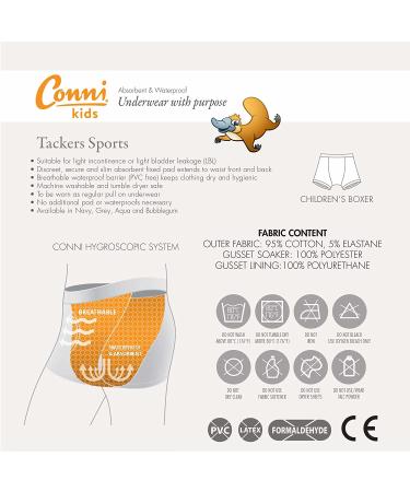 SIZE: 4-6, Waist 22in (or 56cm). COMFORTABLE: With a slim design and soft touch, Conni Tackers Sports look and feel like regular underwear, providing confidence when potty training and for kids that need extra help. COST EFFECTIVE: Machine washable and tumble dryer safe, it can be used countless times and will last as long as normal underwear. ABSORBENT and WATERPROOF: Designed to assist with light bladder loss and bowl incontinence, it is absorbent and waterproof with a four layer protection from the front waistband all the way to back waistband. DITCH THE DIAPERS: Perfect training pants for transitioning out of diapers - the built in absorbent pad catches small accidents while your child learns the up and down routine of normal underwear (Not a replacement for diapers in case of full bladder loss).