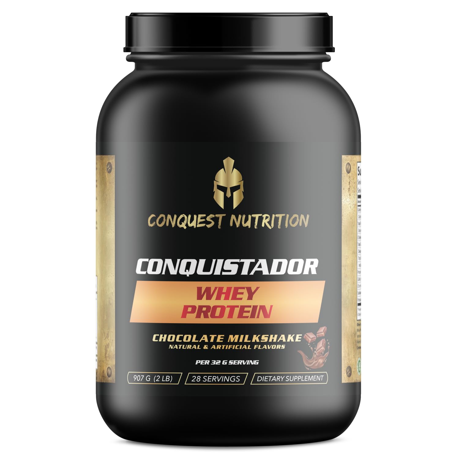 CHOCOLATE MILKSHAKE: Indulge in the smooth, classic taste that mixes easily with water or milk for a satisfying post-workout shake. CONVENIENT SIZE: The 2lb container offers the perfect balance between value and convenience for regular protein supplement users. QUALITY FORMULATION: Manufactured by Conquest Nutrition with high standards to support muscle recovery and growth after workouts. DELICIOUS FLAVOR: Enjoy the rich, creamy chocolate milkshake taste that makes achieving your daily protein intake goals both satisfying and enjoyable. PREMIUM WHEY PROTEIN: Conquistador Chocolate Whey Protein delivers a delicious chocolate milkshake flavor in a convenient 2lb container for your fitness journey.