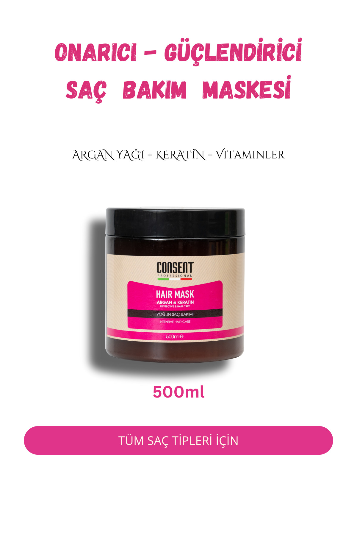 Saç bakim rutininizin vazgeçilmez bir parçasi olarak tasarlanmis olan Consent Argan Keratin Hair Mask, yipranmis saçlariniza derinlemesine bakim yaparak onlari onarir ve besler. Argan yagi ve Keratin'in güçlü birlesimi sayesinde, saç tellerinizin daha saglikli, güçlü ve canli görünmesini saglarken, ayni zamanda saç kreminizin etkisini artirir. Bu saç maskesi, tüm saç tipleri için uygundur ve düzenli kullanimla saçlariniza ihtiyaç duydugu nemi ve besinleri saglar.