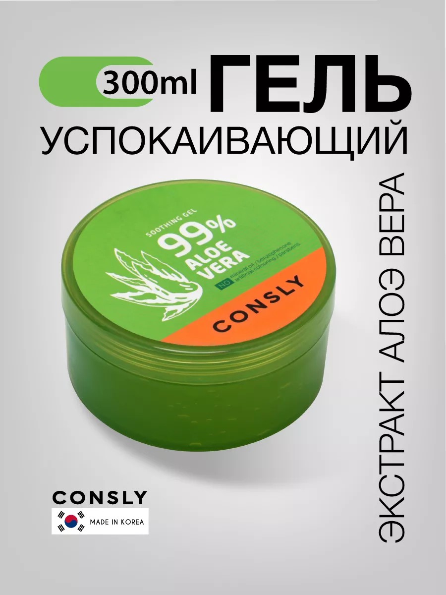 CONSLY Aloe Vera Soothing Gel, 300ml Soothing gel for face, hands and body with aloe vera extract, large volume 300 ml. Moisturizing gel for body care effectively soothes the skin and has a healing effect, starting the recovery processes. The product eliminates discomfort, dehydration and tightness. It is quickly absorbed without creating a film or stickiness effect. Gives smoothness, saturates with antioxidants and protects against premature aging. No mineral oils, no artificial colors, no benzophenone, no parabens. For all skin types: for dry, normal and oily. How to use the gel: 1) as a makeup base, 2) as a light night and day cream; 3) as a moisturizing mask (apply a thick layer for 15 minutes); 4) as a soothing aftershave and epilation product; 5) after-sun and sunburn relief; 6) as a body massage gel. An ideal gift for a woman: mom, friend, or girlfriend for a birthday, New Year, March 8th, or Valentine's Day. Recommended for use in combination with the Consly line of Korean facial and body care cosmetics.
