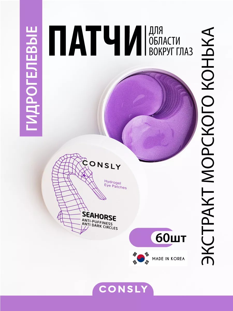 CONSLY Hydrogel Seahorse Eye Patches, 60 pcs. These Korean hydrogel eye patches effectively reduce puffiness and dark circles under the eyes. These refreshing hydrogel patches help reduce signs of fatigue, remove excess fluid, refresh your eyes, and restore natural tone. Seahorse extract is a unique Korean ingredient that actively restores and tones the skin, stimulating cell renewal. Seahorse extract breaks down pigment, which is often the cause of dark circles under the eyes. The refreshing effect is enhanced by caffeine, bamboo extract, and grapefruit seed extracts. Caffeine has an anti-edema effect. Niacinamide reduces dark circles and restores a healthy, vibrant tone to the skin under the eyes. Korean skincare products against wrinkles, puffiness, and dark circles under the eyes. Anti-aging patches are suitable for all skin types, especially normal or dry skin. Directions: Remove patches with a spatula and place them on the skin around the eyes, ensuring a tight fit. Remove after 20-30 minutes. Pat the remaining rejuvenating essence into the skin with your fingertips. A gift set of Korean Consly patches for a woman—a mother, a friend, or a girlfriend—for a birthday, New Year, or March 8th. Recommended for use in combination with the CONSLY series of Korean cosmetics for face and body care.