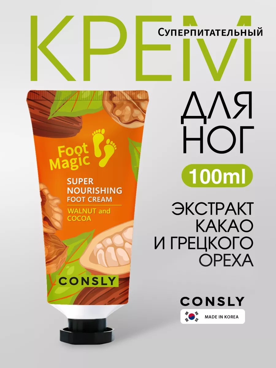 Consly Super Nourishing Foot Cream, 100ml. Корейская уходовая косметика. Питательный крем для ног Корея с экстрактом какао и грецкого ореха обеспечивает интенсивное питание и увлажнение сухой кожи стоп. Крем глубоко проникает в эпидермис, смягчая огрубевшие участки и восстанавливая поврежденную кожу. Экстракт какао насыщает кожу стоп полезными витаминами и минералами, стимулирует процессы регенерации клеток и укрепляет структуру эпидермиса. Он способствует восстановлению поврежденной кожи, делает ее более эластичной и упругой, а также дарит ощущение нежности и комфорта. Экстракт грецкого ореха укрепляет защитный барьер кожи, помогает удерживать влагу и защищает от негативного воздействия окружающей среды. В результате регулярного применения крема кожа стоп становится мягкой, гладкой и ухоженной на протяжении всего дня. Крем быстро впитывается без липкого слоя, оставляя приятное ощущение комфорта и ухоженности. Питательная формула помогает предотвратить сухость, трещины и шелушение, возвращая коже здоровье и привлекательный вид. Регулярное применение смягчает натоптыши, улучшает текстуру кожи и придает ей ухоженный, ровный тон. Особенно актуален в холодное время года, когда кожа стоп нуждается в особом уходе и защите от внешних факторов. Легкая текстура крема легко распределяется по коже, быстро впитывается, не оставляя липкости и жирного блеска. Питательная формула помогает смягчить натоптыши, заживить мелкие трещинки и уменьшить шелушение, улучшая общее состояние кожи. Крем идеально подходит для ежедневного ухода и особенно актуален в холодное время года, когда кожа стоп нуждается в дополнительной защите и питании. Подходит для всех типов кожи, включая сухую и чувствительную. Способ применения: нанесите крем на чистую кожу стоп легкими массирующими движениями до полного впитывания. Для максимального эффекта рекомендуется использовать в комплексе с другими средствами корейской уходовой косметики Consly / Консли.