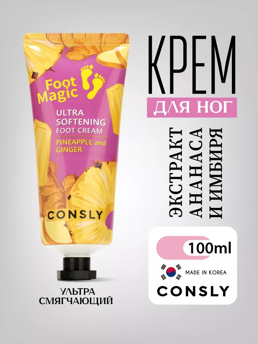 Moisturizing and softening foot cream helps combat dry skin. Ultra Softening Foot Cream, 100ml. This ultra-softening foot cream provides a gentle exfoliating effect with regular use. Pineapple, lemon, and ginger extracts restore skin elasticity, provide smooth heels, and help with cracks and calluses. This moisturizing and nourishing cream stimulates skin renewal, effectively reducing calluses and cracks, and is especially suitable for dry foot care. It prevents foot odor, prevents unpleasant odors, and refreshes. Suitable for massage, the cream promotes muscle relaxation and improves circulation. It gently restores the epidermis structure, smoothing its surface. This product perfectly cares for heels, eliminating dryness and minor damage. Its use allows you to maintain healthy feet every day. An ideal gift for a woman, mother, friend, or girlfriend for a birthday, New Year, or International Women's Day. Recommended for use in combination with the CONSLY series of Korean skincare products.