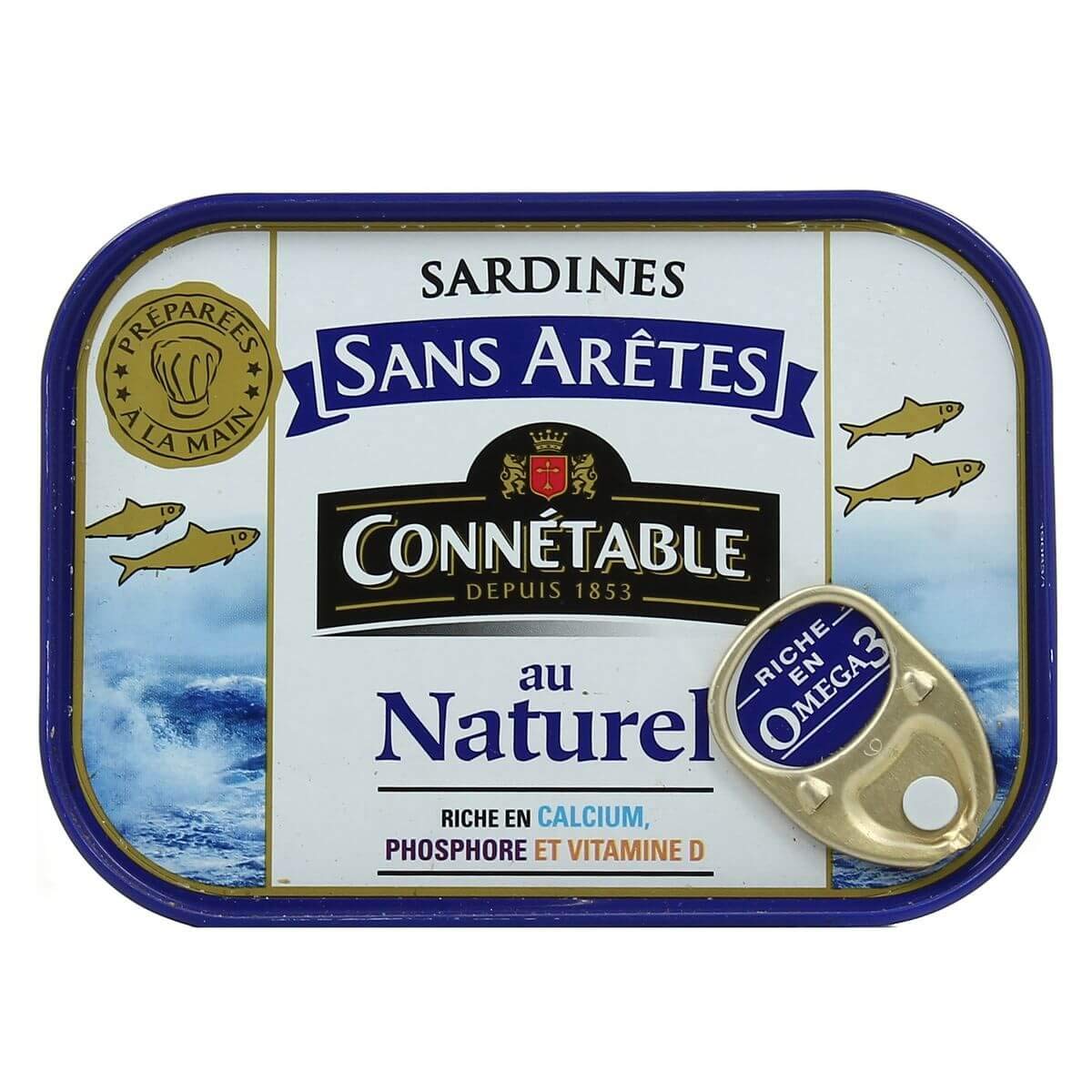 Boneless sardines in natural form For your health, practice regular physical activity. Rich in Calcium (254 mg 100g), Phosphorus (284 mg 100g), Vitamin D (6.4 g 100g) and Omega 3 (2.3g 100g) Chancerelle F-29100 Douarnenez INGREDIENTS SARDINES, water, lemon, salt, natural flavoring. Allergens: FISH DIRECTIONS FOR USE Best before: see the date on the box. After opening, keep refrigerated and consume within 2 days. DISCLAIMER Non-contractual photograph. The above information is provided for information purposes only. It is not necessarily exhaustive and cannot replace the information on the product packaging, which alone is authentic and to which you are invited to refer, particularly in the event of food intolerance. The 98g box. Sardines sans arêtes au naturel Pour votre santé, pratiquez une activité physique régulière.Riche en Calcium (254 mg 100g), Phosphore (284 mg 100g), Vitamine D (6,4 g 100g) et Oméga 3 (2,3g 100g) Chancerelle F-29100 Douarnenez INGRÉDIENTS SARDINES, eau, citron, sel, arome naturel. Allergènes : POISSON MODE D'EMPLOI A consommer de préférence avant le : voir la date figurant sur la boite. Après ouverture, à conserver au réfrigérateur et à consommer dans les 2 jours. CLAUSE DE NON-GARANTIE Photographie non contractuelle. Les indications ci-dessus sont données à titre d'information. Elles ne sont pas forcément exhaustives et ne sauraient se substituer aux informations figurant sur l'emballage du produit qui font seules foi, et auxquelles vous êtes invités à vous reporter, notamment en cas d'intolérance alimentaire. La boîte de 98g.