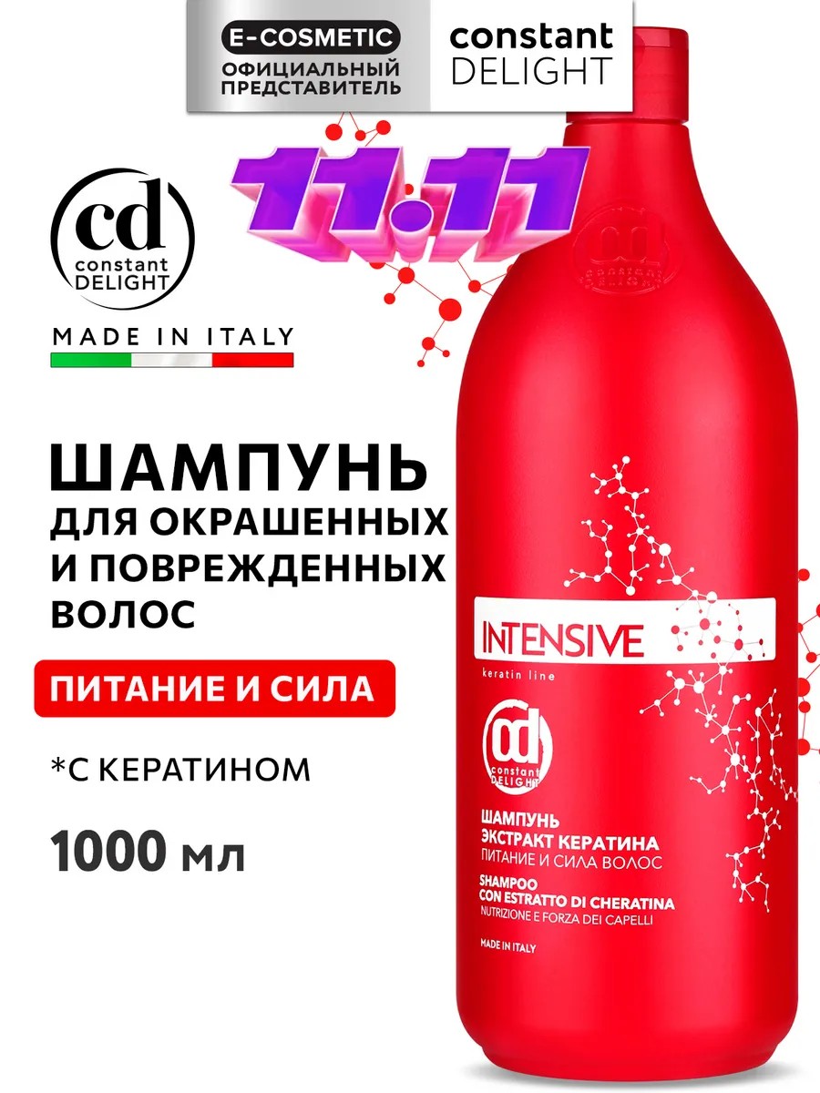 Professional shampoo 1000 ml INTENSIVE CONSTANT DELIGHT with keratin extract is designed to care for colored, fine and weakened hair in need of nutrition and restoration. Ideal for those who experience loss of volume, brittleness and dryness after coloring.
