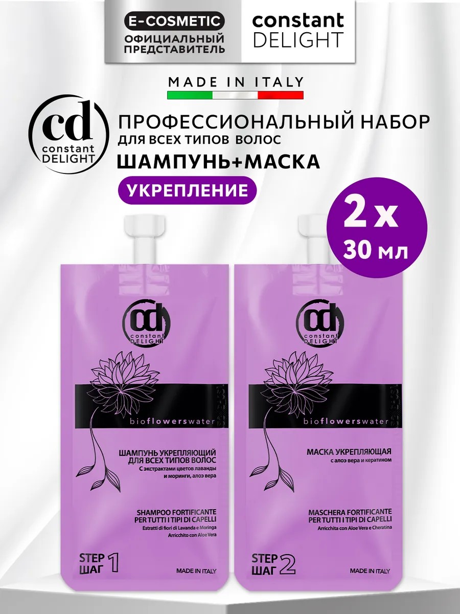 Профессиональный мини дорожный набор шампунь и маска 30+30 мл BIO FLOWERS CONSTANT DELIGHT для укрепления волос, направленный на восстановление прочности и эластичности всех типов, особенно за ослабленными, тонкими и склонными к выпадению волосами. Удобный travel формат можно взять с собой в поездку или путешествие.