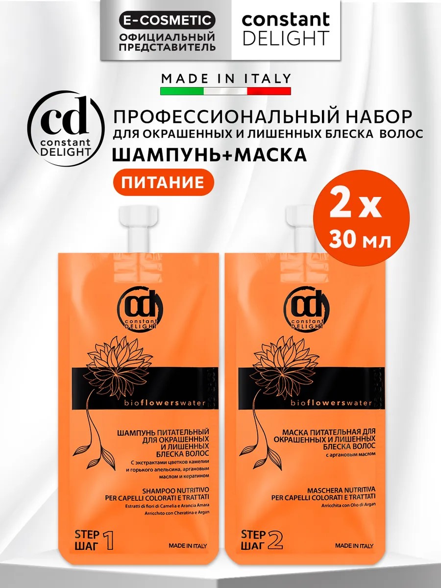 Профессиональный мини дорожный набор шампунь и маска 30+30 мл BIO FLOWERS CONSTANT DELIGHT создан для питания окрашенных, обесцвеченных, химически завитых или выпрямленных локонов, нуждающихся в восстановлении и защите. Удобный travel формат можно взять с собой в поездку или путешествие.