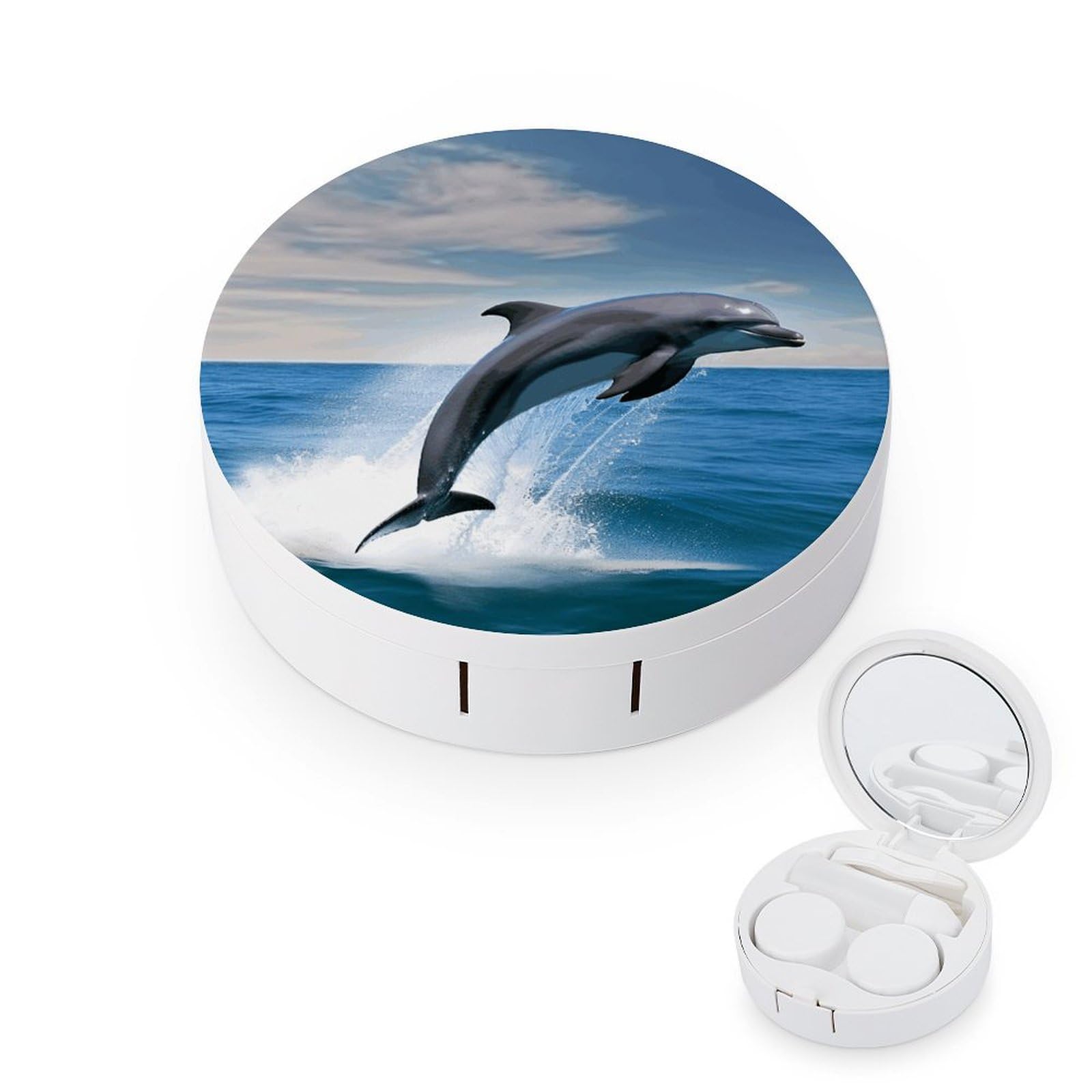 This Jumping Up Dolphins print cute small glasses case comes with a convenient built-in mirror,ensuring you have a clear view and quick makeup touch-ups anytime,anywhere,thoughtful design,easy to use,no need to twist the lid,with a sealing ring,no leakage,contact lens storage box bringing you a wonderful sense of fashion When you go outdoor travel,camping,sports,office or daily use,our small contact lens travel box is colorful,very cute and unique.you can choose a beautiful and high-value contact lens storage box as a gift for your family or friendsIntimate design:The cute contact lens case comes with a delicate mirror,which is convenient for wearing contact lenses.the split glasses compartment can distinguish the left and right well.these practical tools can help you wear,remove and clean contact lenses in daily life without touching them easily. Easy to carry:Contact lens care box lightweight and compact,you can put it in your wallet,bag,pocket,handbag or car or any small space,and it will not take up too much space.it is convenient for you to carry contact lenses and all useful tools in your wallet or handbag when traveling outdoors and for daily use. Exquisite and compact:The round glasses case has a cute design,which is easy to use and can be better held in the hand.it is convenient to carry your contact lenses and various tools.the surface can be diy with your favorite patterns,which is fashionable and atmospheric. Compact configuration:This glasses case is equipped with a preservation liquid bottle + double box.there is an r on the bottom to distinguish the left and right sides + tweezers + wearing stick.the cute contact lens case is small and compact and easy to carry. Safe material:This Jumping Up Dolphins print portable contact lens case is made of high-quality plastic material,which can safely soak and store contact lenses.it is safe for eyes,environmentally friendly,durable and suitable for long-term use.
