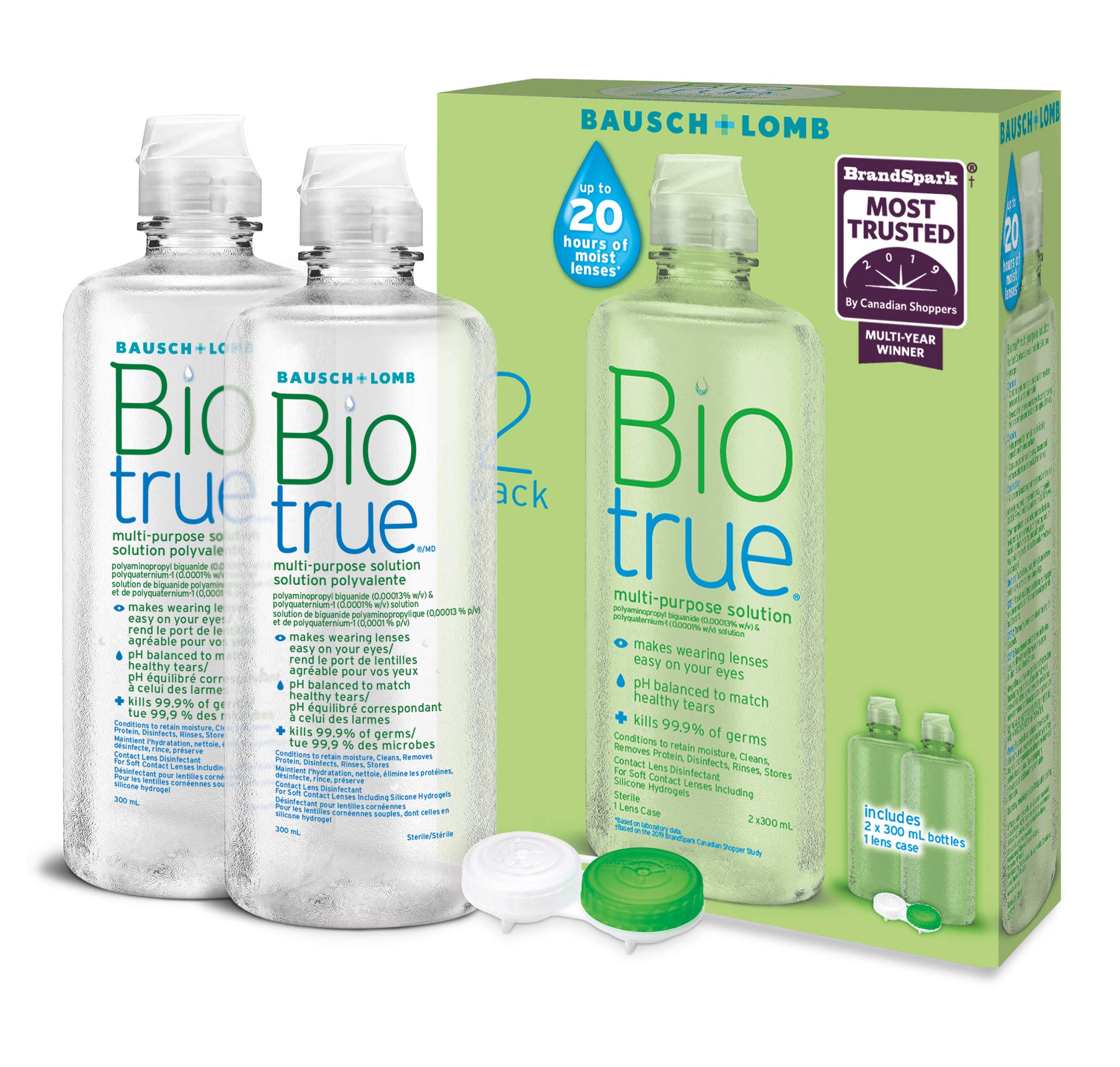 Bausch Lomb biotrue multi-purpose solution by studying how the eyes work to clean, hydrate and keep themselves healthy. Utilizes a lubricant to provide up to 20 hours of moist lenses for comfort throughout the day. pH balanced to match tears. Cleans and disinfects. Carton and bottle are 100 percent recyclable. Available in 300-milliltre pack.Available in 300-milliltre pack. Cleans and disinfects. pH balanced to match tears. Utilizes a lubricant to provide up to 20 hours of moist lenses for comfort throughout the day. Biotrue multi-purpose solution.