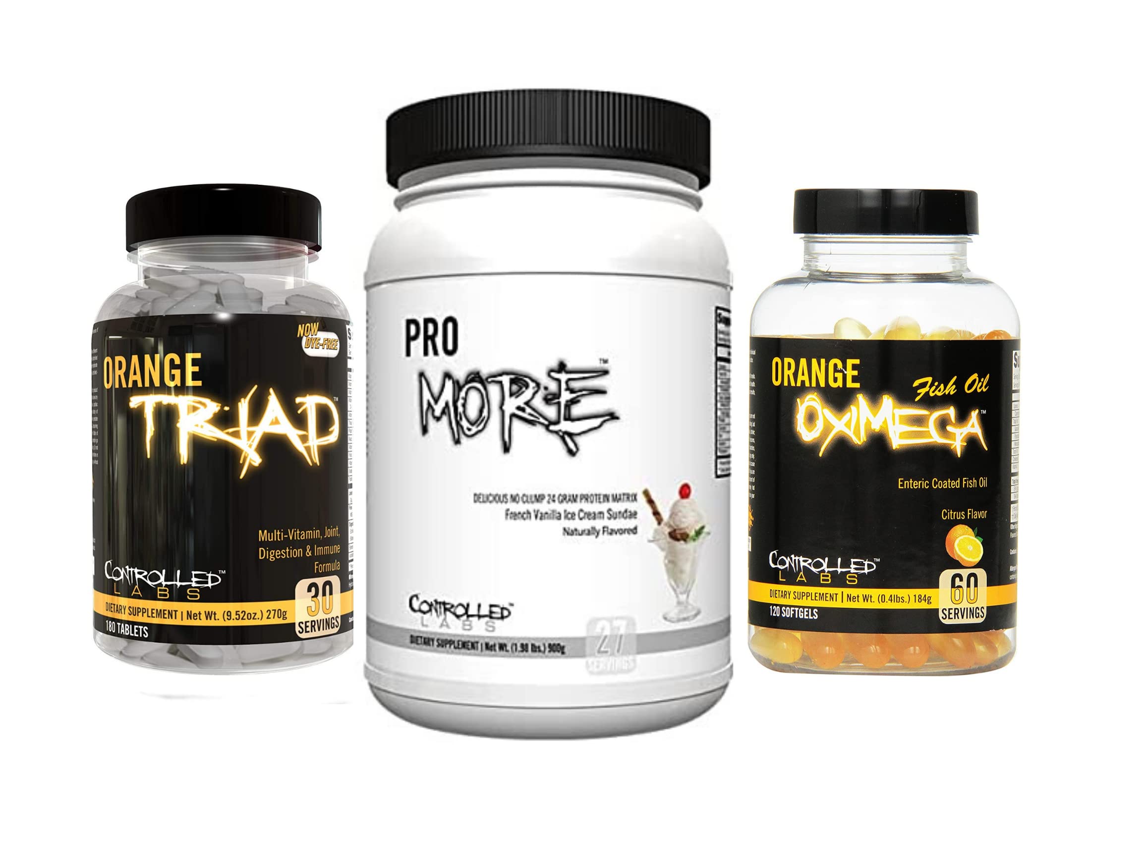 CONTROLLED LABS Bundle - Orange Triad (30 Serv), Orange Oximega Fish Oil (120 softgels), PROmore Protein (27 Serv) French Vanilla Ice Cream Sundae
