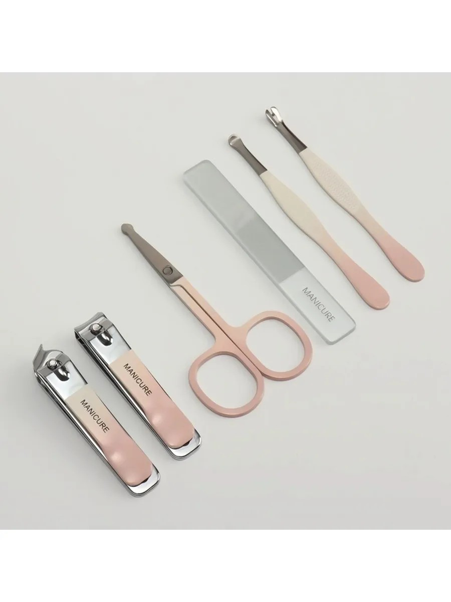 Ensure perfect nail care with our versatile manicure set, featuring six high-quality pieces neatly arranged in an elegant beige and peach case.