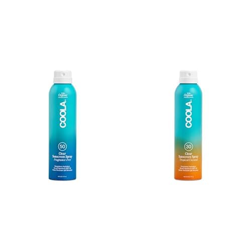 COOLA Organic Sunscreen Bundle - SPF 50 Fragrance Free & SPF 30 Tropical Coconut Sunblock Spray Dermatologist Tested Vegan 6 Fl Oz Each