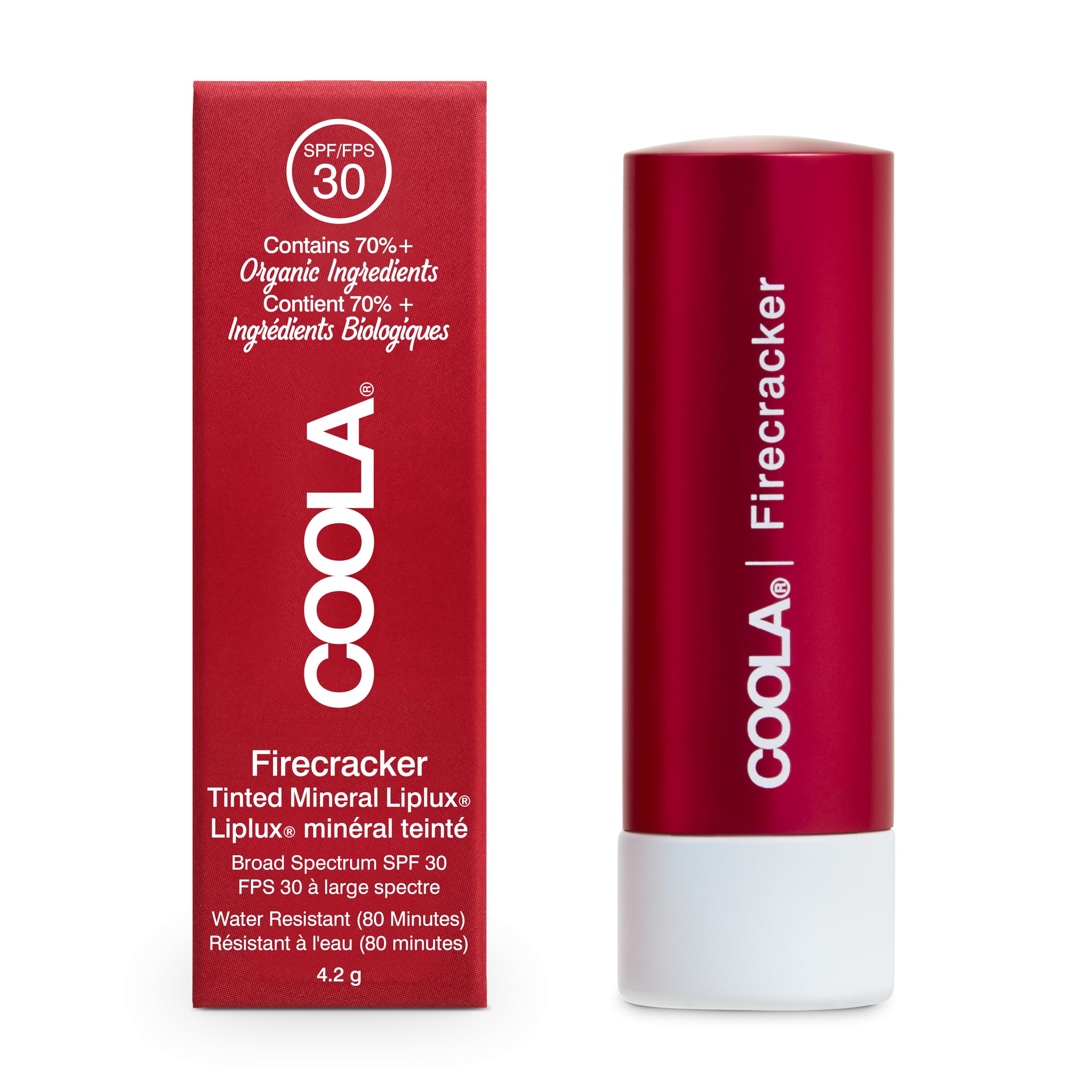 COOLA Tinted Mineral Liplux Sunscreen SPF 30 uses natural pigments to add a hint of subtle, rosy color while protecting, nourishing, and softening your lips. Organic cupuaçu butter and mongongo oil provide an ultra-creamy texture that smooths and nourishes lips, keeping them moisturized for a healthy, plump, and youthful appearance. INSTRUCTIONS FOR USE Apply 15-30 minutes before sunbathing. Reapply every 2 hours or after swimming or sweating. Also use other sun protection methods such as protective clothing and seek shade. SAFETY WARNING For external use only. Avoid contact with eyes. Keep away from naked flame or direct heat sources. See moreLip balm.COOLA Tinted Mineral Liplux Sunscreen SPF 30 - Firecracker (4.2 g) COOLA Tinted Mineral Liplux Sunscreen SPF 30 uses natural pigments to add a hint of subtle, rosy color while protecting, nourishing, and softening your lips. Organic cupuaçu butter and mongongo oil provide an ultra-creamy texture that smooths and nourishes lips, keeping them moisturized for a healthy, plump, and youthful appearance. GEBRUIKSAANWIJZING 15-30 minuten voor het zonnebaden aanbrengen. Elke 2 uur of na het zwemmen of zweten opnieuw aanbrengen. Gebruik ook andere zonweringsmethoden zoals beschermende kleding en zoek naar schaduw. VEILIGHEIDSWAARSCHUWING For external use only. Avoid contact with eyes. Keep away from naked flame or direct heat sources. Meer bekijkenLip balm.