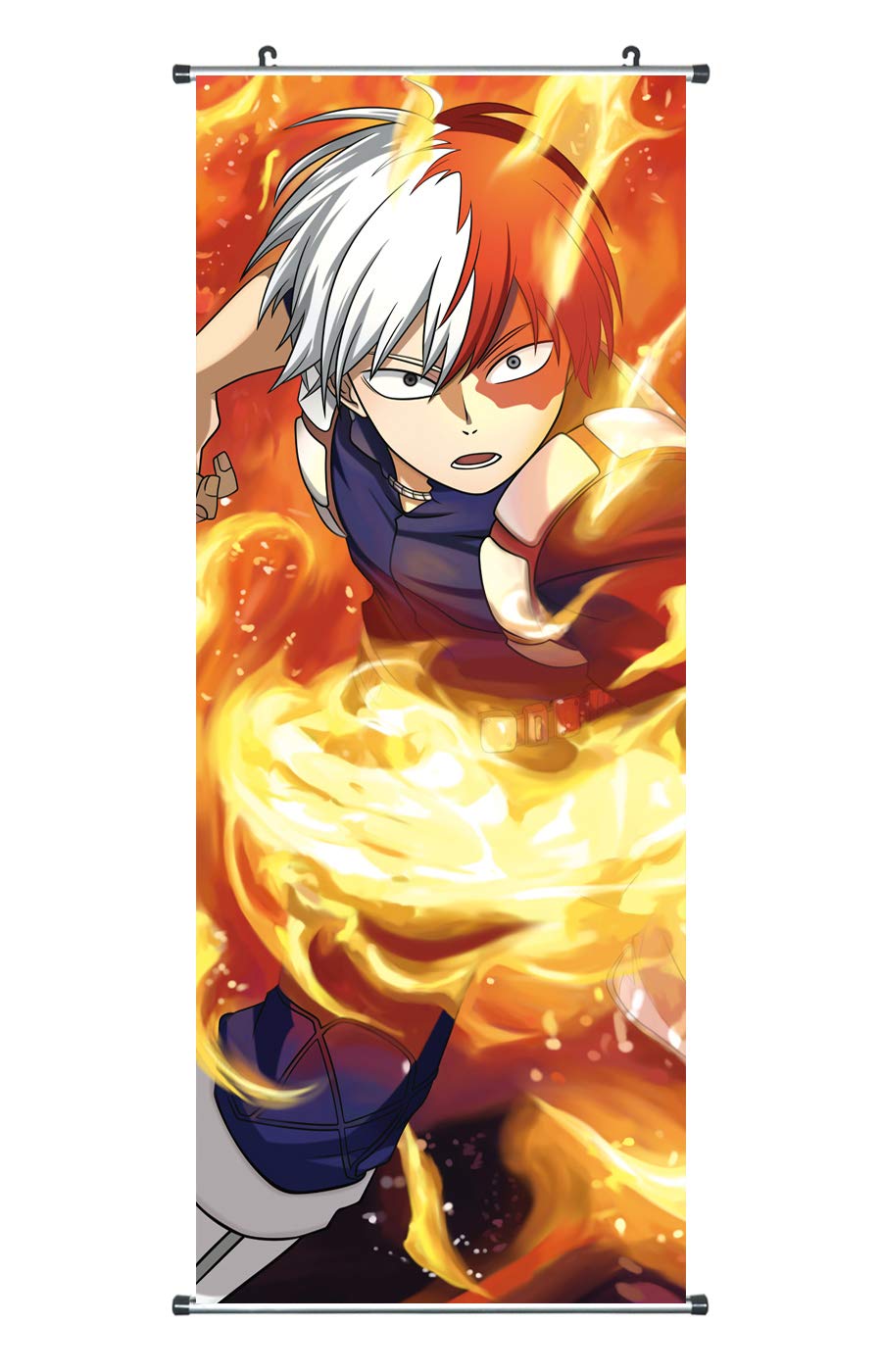 Motiv: Shoto Todoroki. Einfaches Aufhängen dank zwei Aluminiumrohren und zwei Haken. Größe: ca. 100x40cm. Farbiger Druck auf Stoff. Großes Kakemono (Rollbild) mit My Hero Academia Motiv.
