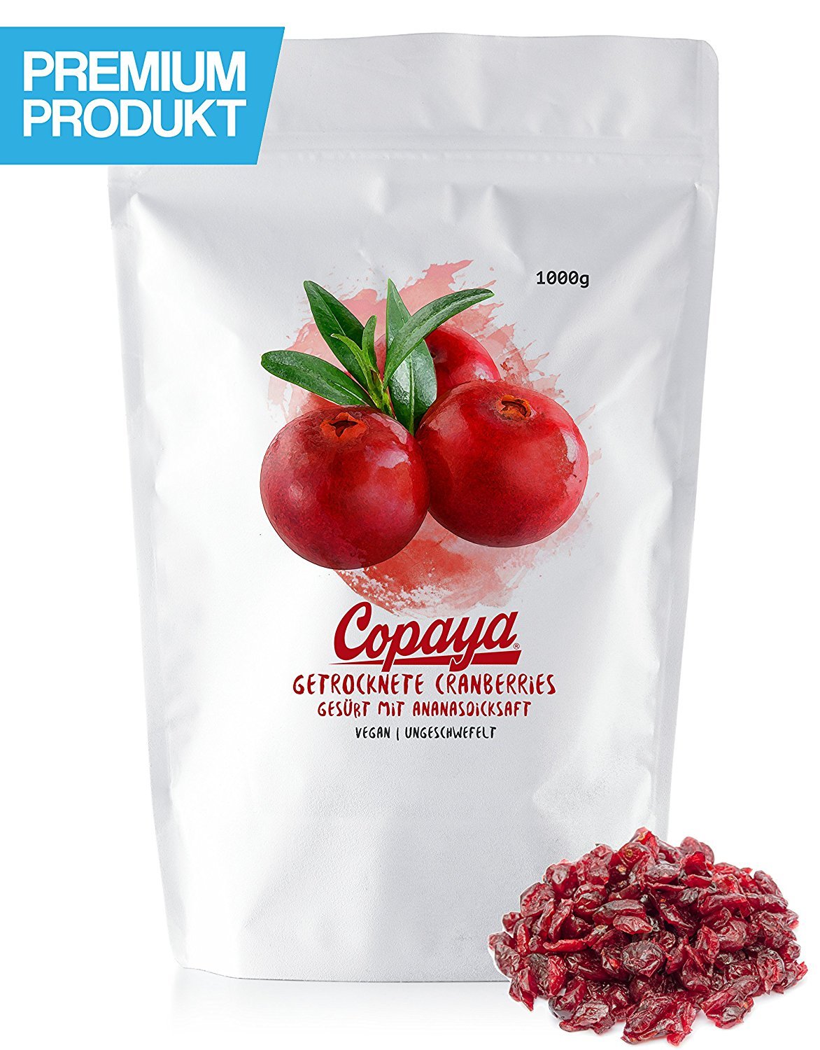 Copaya – Dried cranberries with thick pineapple juice. This fruit is called the large-fruited cranberry or the cranberry, but it is more commonly known as the cranberry. Cranberries are a plant species in the blueberry family. Cranberries have a tart, sour taste as a fresh fruit, but during drying, they lose their acidity and develop a sweeter flavor. Cranberries are a staple in North America and are gaining increg popularity in Europe. The Indigenous peoples of North America knew how beneficial cranberries are for health. A very high level of vitamins C, A, and B, phytochemicals, fiber, and minerals such as magnesium, sodium, and iron make cranberries an excellent source of energy, making them a perfect addition to the daily lives of vegetarians and vegans. The low sugar content makes cranberries a low-carbohydrate fruit, which is why they are considered particularly healthy. Suggested use: Our cranberries are sweetened with thick pineapple juice and are therefore free of refined sugars. This gives them their unique sweet and sour taste. Cranberries are especially suitable for cereals, yogurt, or as a fruity addition to salads. In German-speaking regions, cranberries are also used as an ingredient in bath products. Ingredients: 55 cranberries, 42 pineapple juice, 2 clarified pineapple juice concentrate, 1 sunflower oil. Origin: USA.Copaya Cranberries gesüßt mit natürlichem Ananasdicksaft, ungeschwefelt und ungezuckert im Aromaschutzbeutel 250gDESCRIPTION DU PRODUIT Copaya – canneberges séchées avec du jus épais d'ananas. Ce pays s'appelle la canneberge à gros fruits ou la canneberge, mais elle est plutôt connue sous le nom de canneberge. Les canneberges sont une espèce végétale du genre des myrtilles. Les canneberges ont un goût acidulé et acidulé en tant que fruit frais, mais pendant le séchage, elle perd l'acidité et développe un goût sucré. Les canneberges sont incontournables sur le continent nord-américain et gagnent de plus en plus d'importance en Europe. Les peuples autochtones d'Amérique du Nord savaient à quel point les canneberges sont bénéfiques pour la santé. Un très haut niveau de vitamines C, A et B, des composés phytochimiques, des fibres et des minéraux tels que le magnésium, le sodium et le fer font que les canneberges sont un excellent apport énergétique, ce qui en fait un complément parfait à la vie quotidienne des végétariens et végétaliens. La faible teneur en sucre fait de la canneberge un fruit à faible teneur en glucides, c'est pourquoi elle est considérée comme particulièrement saine. Recommandation d'utilisation : Nos canneberges sont sucrées avec du jus épais d'ananas et sont donc exemptes de sucres raffinés. Cela révèle le goût aigre-doux incomparable. Les canneberges conviennent particulièrement pour les céréales, les yaourts ou comme complément fruité à la salade. Dans les régions germanophones, la canneberge est également utilisée comme ingrédient pour le baing. Ingrédients : 55 canneberges, 42 de jus d'ananas, 2 concentré de jus d'ananas clarifié, 1 d'huile de tournesol. Origine : États-Unis.