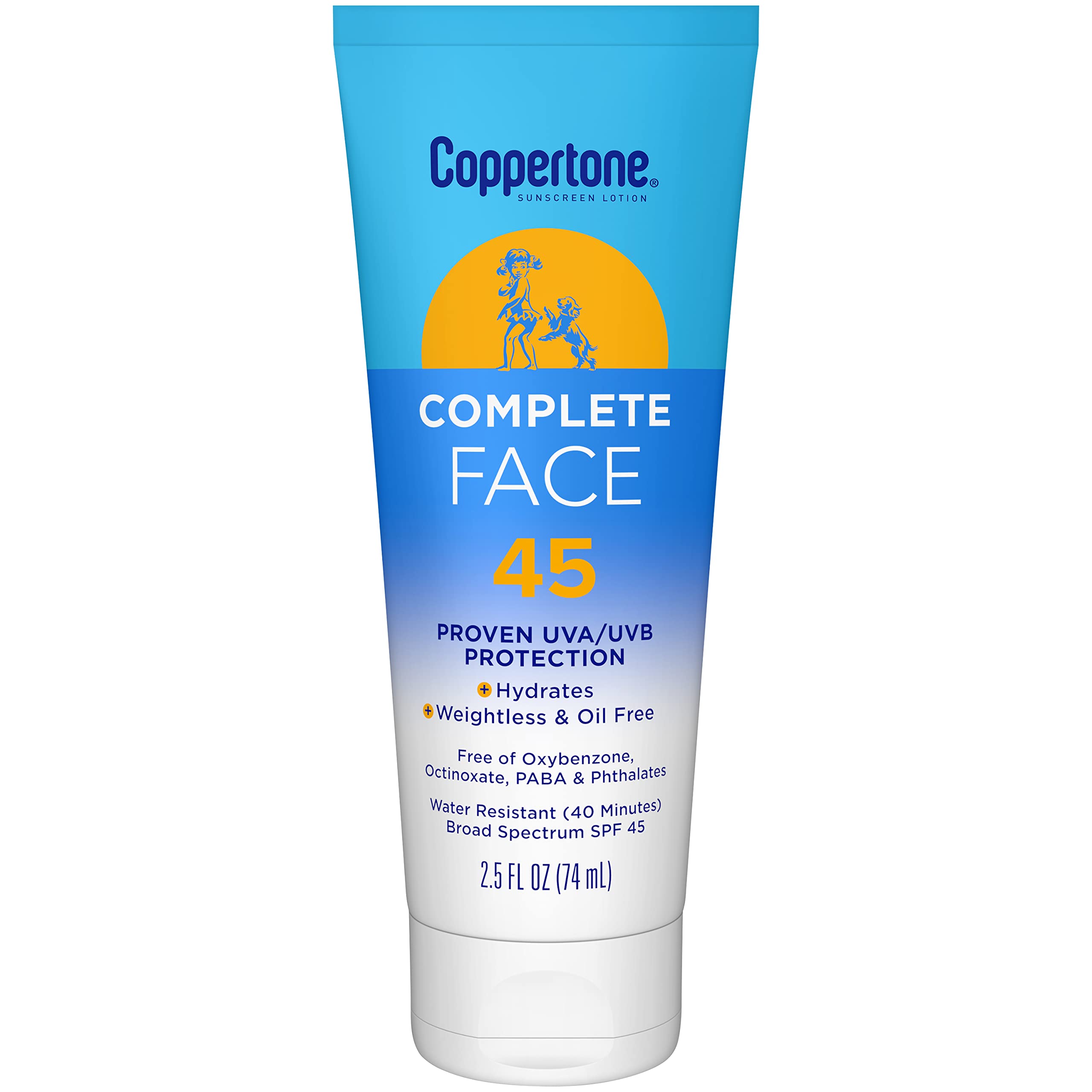 Coppertone Complete Face Sunscreen Lotion provides everyday sun protection for the whole family. With a multi-benefit formula that is designed for the face, this daily sunscreen with SPF 45 helps protect your face from the sun with a durable and water-resistant formula (40 minutes). It blends in clear and stays clear on all skin tones and hydrates skin while offering Broad Spectrum UVA UVB protection and stopping up to 98 of damaging UV rays. Weightless and oil-free, this moisturizing sunscreen rubs on easily and dries quickly without clogging pores. Perfect for everyday use, this fragrance free sunscreen is also free of oxybenzone, octinoxate, PABA, parabens and phthalates. Help protect the rest of your body from the sun's damaging UV rays with Coppertone Complete Sunscreen Lotion, an everyday sunscreen that's perfect for the whole family. Each sunscreen Coppertone creates follows a tradition of trusted, quality sun protection products. Coppertone has been providing innovation for more than 75 years, and was voted the most trusted sunscreen brand.(1) Use and reapply this Coppertone sunscreen lotion as directed. (1)Voted Most Trusted Sunscreen Brand by American Shoppers Based on the 2022 BrandSpark American Trust Study.