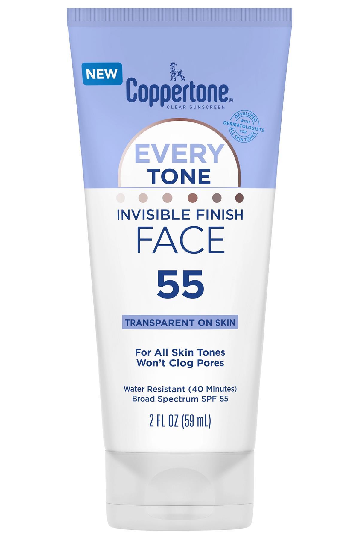Coppertone Every Tone Face is a lightweight, daily facial sunscreen with an invisible finish. This sunscreen is specially formulated to blend clearly on all skin tones. It offers Broad Spectrum UVA UVB SPF 55 protection and helps stop up to 98 of harmful UV rays. It does not contain Oxybenzone, Octinoxate, PABA and Phthalates. It does not clog pores, is suitable for use under make-up and is water resistant (40 minutes).