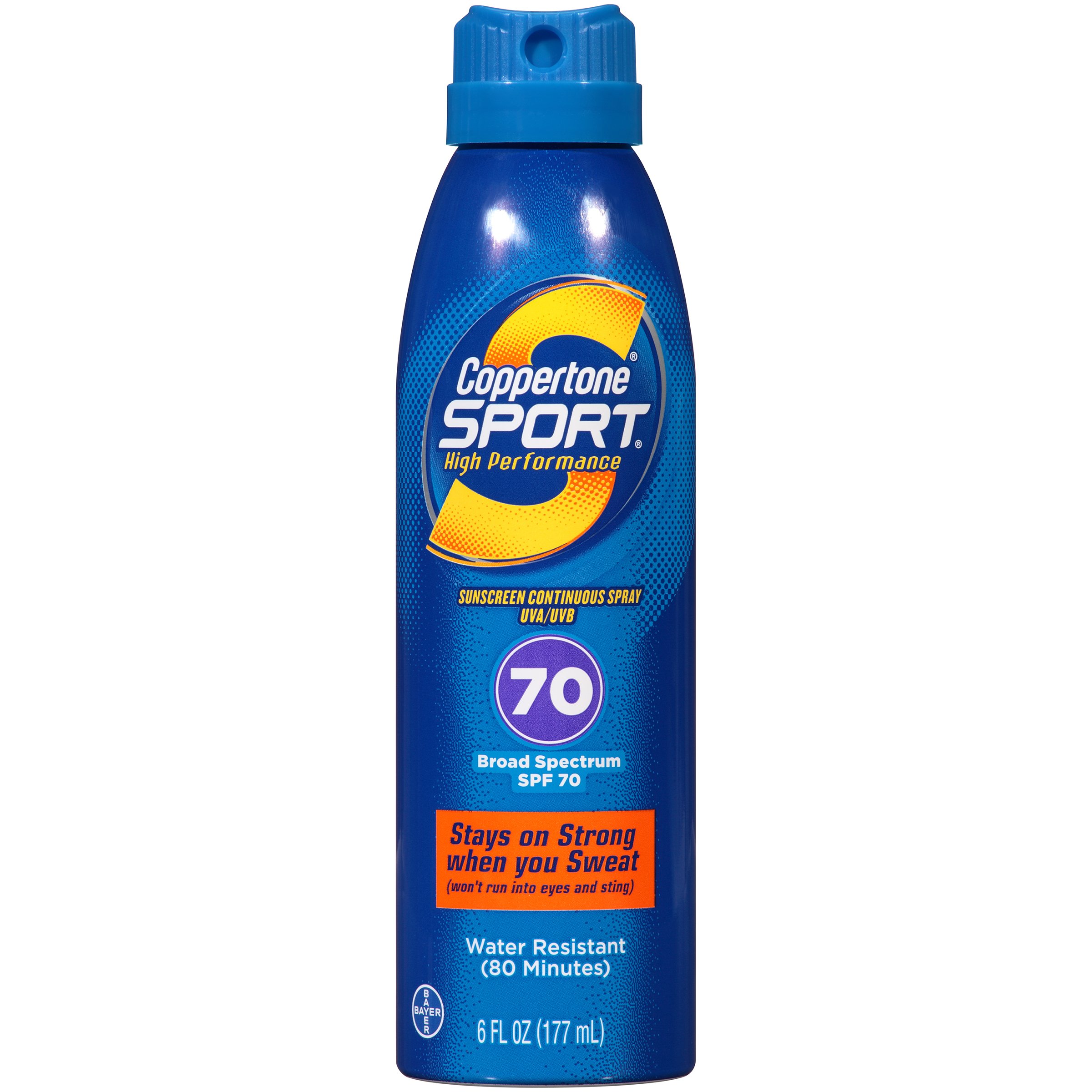 Coppertone Sport .AccuSpray™ Sunscreen Broad Spectrum SPF 70. Accurate spray technology. High performance. Continuous spray you can control. UVA UVB. Stays on strong when you sweat. Won't run into eyes and sting. Water resistant (80 minutes). Covered by the Bayer HealthCare LLC – Consumer Health 60-Day Satisfaction Guarantee. See below for details