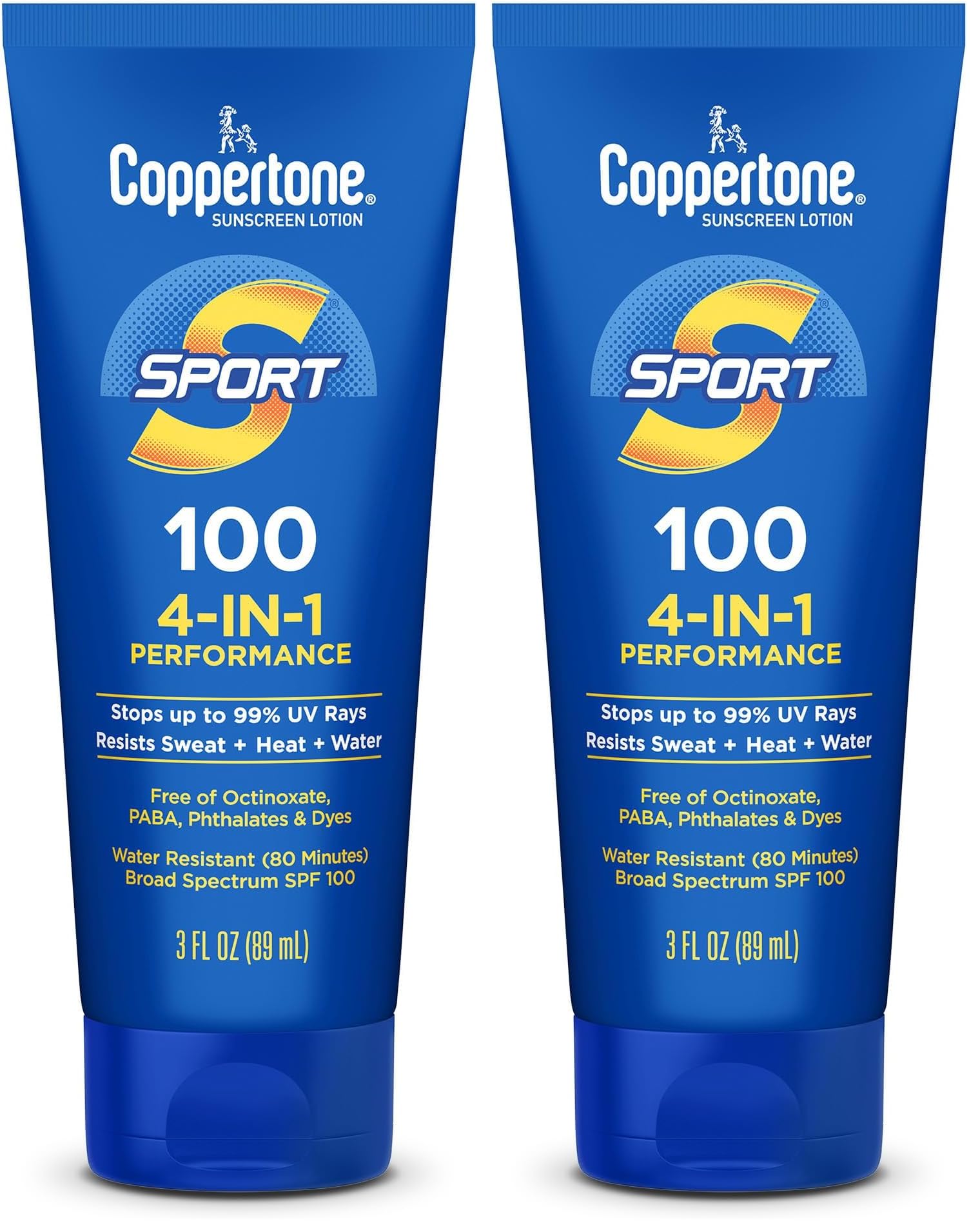 One (1) 3 fluid ounce bottle of Coppertone Sport Sunscreen Lotion SPF 100. One (1) 3 fluid ounce bottle of Coppertone Sport Sunscreen Lotion SPF 100. Trusted Brand: Voted most trusted sunscreen brand by American shoppers based on the 2022 BrandSpark American trust study. Free Of: This Coppertone Sport sunscreen lotion is free from Octinoxate, PABA, phthalates dyes. Water Resistant: Coppertone Sport SPF 100 sunscreen lotion is water resistant (80 minutes), and stays on strong when you sweat. The information below is per-pack only.