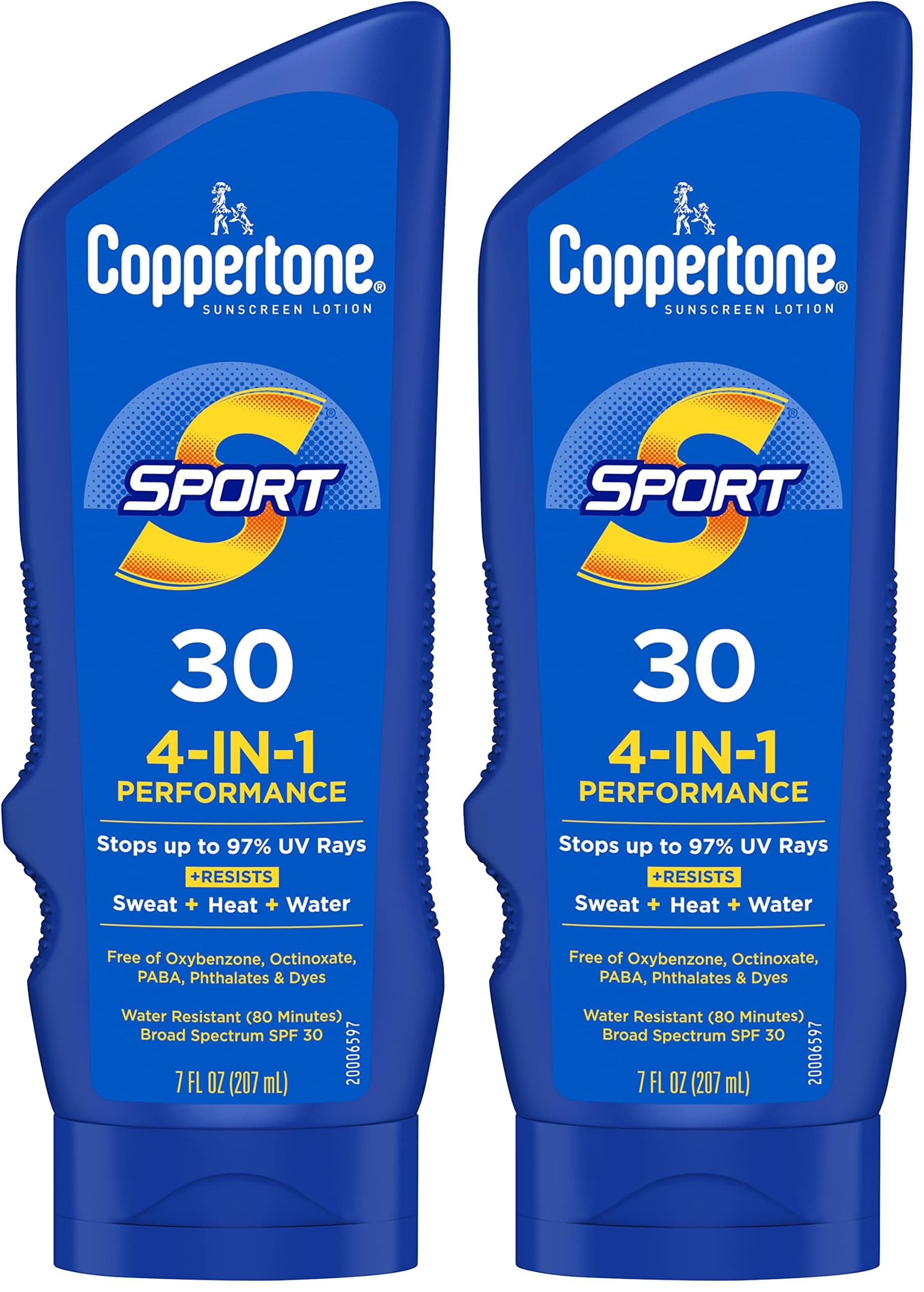 Includes twelve one 7 fluid ounce bottle of Coppertone Sport SPF 30 Sunscreen Lotion. Trusted Brand: Voted most trusted sunscreen brand by American shoppers based on the 2022 BrandSpark American trust study. Free Of: This Coppertone Sport sunscreen lotion is free from dyes, PABA, Octinoxate and Oxybenzone. Water Resistant: Coppertone Sport SPF 30 sunscreen lotion is water resistant (80 minutes), and stays on strong when you sweat. Protects against 98 of UV rays. The information below is per-pack only.