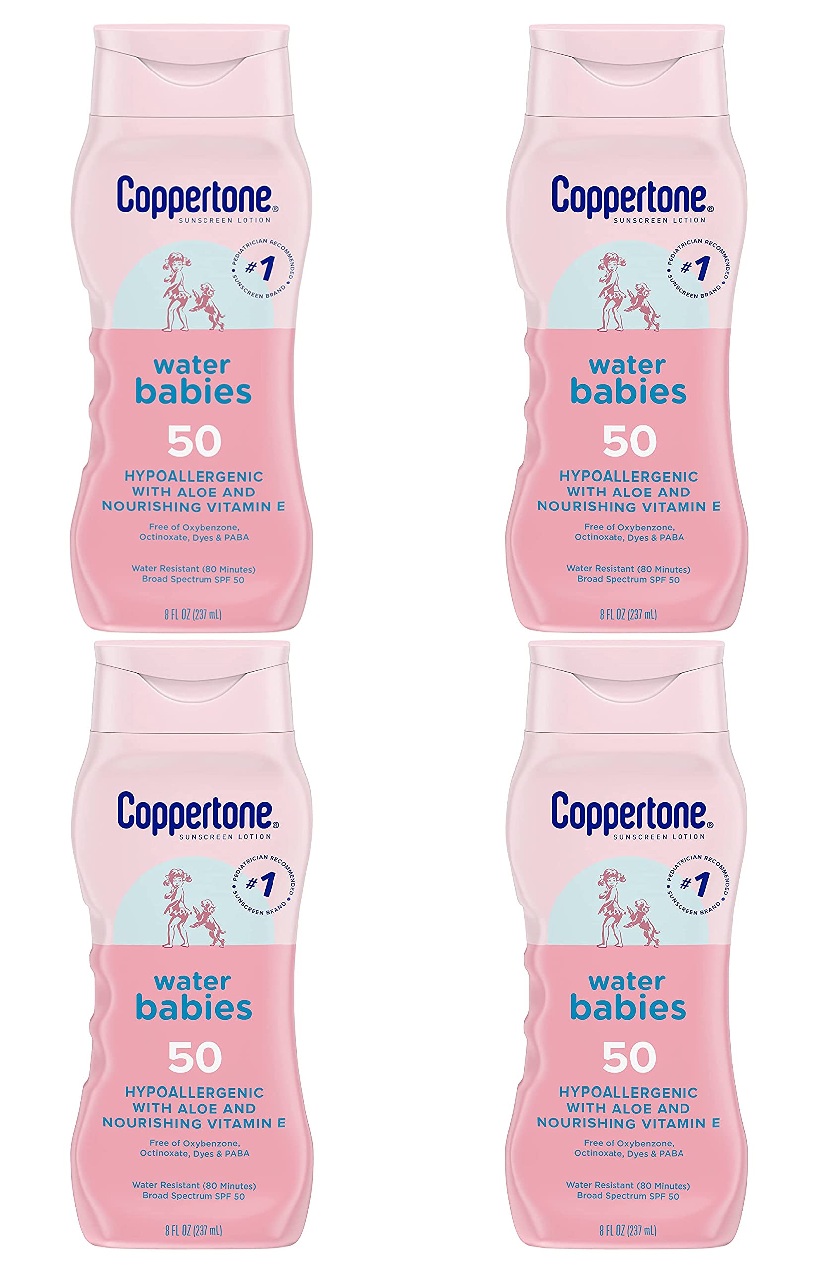 Coppertone Water Babies Sunscreen Lotion with SPF 50, 8 fl oz. A hypoallergenic and gentle sunscreen lotion that protects your baby's skin from the sun with a water resistant formula that's dermatologically tested and free of PABA, dyes, octinoxate, and oxybenzone. The hypoallergenic, gentle, and non irritating formula also contains aloe and nourishing vitamin E. The formula is made to protect baby's skin form up to 98 of the sun's most damaging UV rays. Apply whenever fun takes you outside, whether it's a day at the beach or playing by the pool.