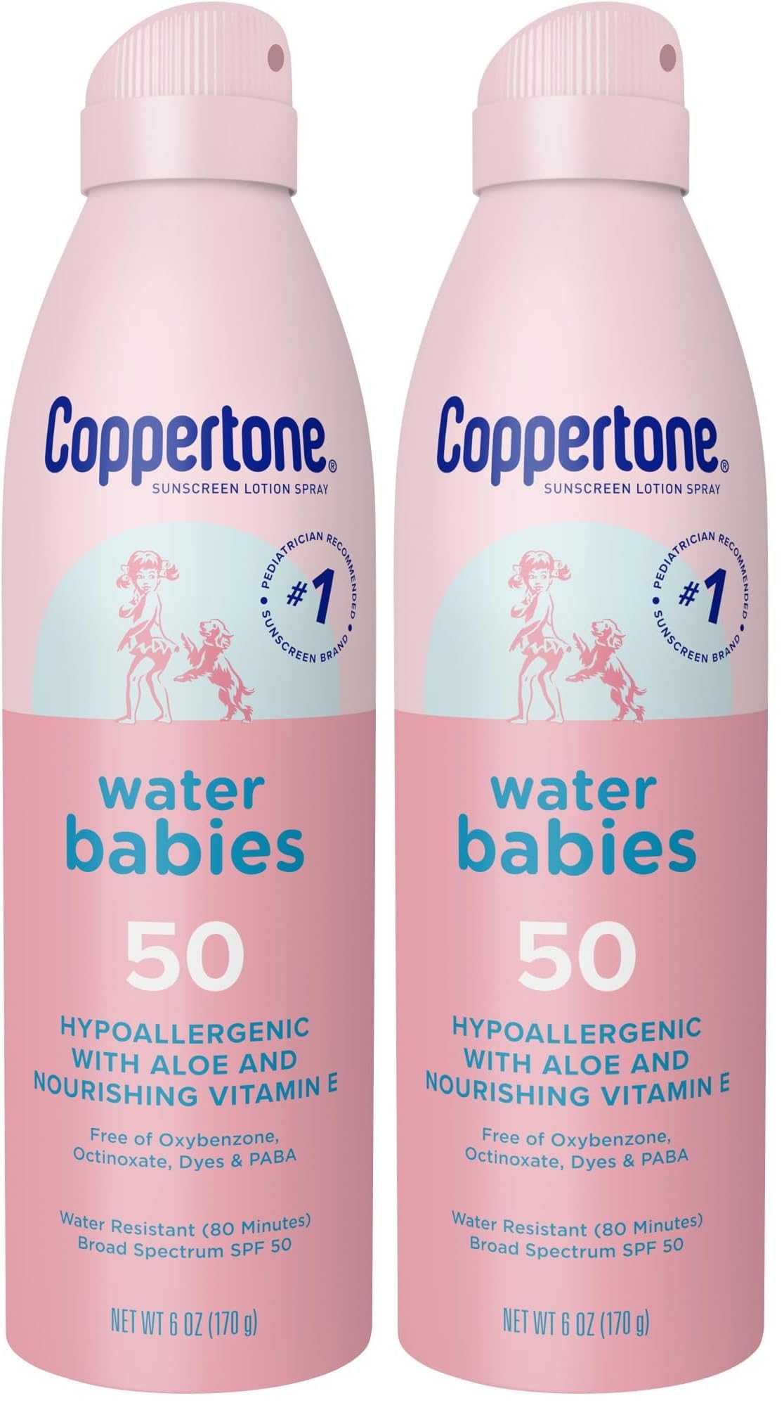 Includes one 6 ounce can of Coppertone WaterBabies Baby Sunscreen SPF 50 Spray. This Coppertone sunscreen is perfect for family fun in the sun. Water Resistant: This Coppertone sunscreen spray stays on strong in the water (water resistant 80 minutes). UV Protection: This Broad Spectrum sunscreen protects baby's skin from up to 98 of the sun's most damaging UV rays. Pediatrician Recommended: From the 1 pediatrician recommended sunscreen brand(2), this Coppertone baby sunscreen is hypoallergenic and gentle. The information below is per-pack only.