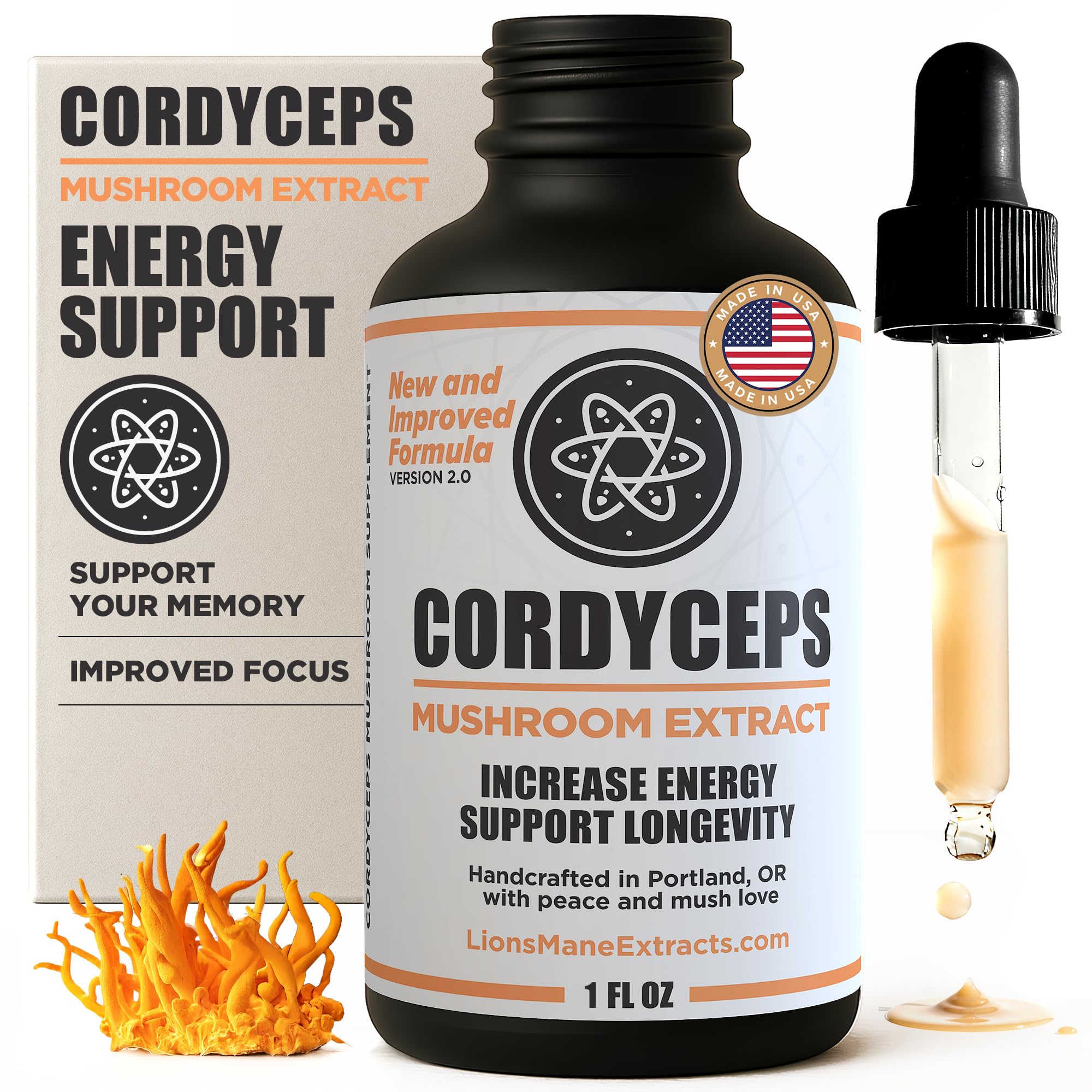 Boost your stamina, and endurance with our Premium Cordyceps Mushroom Extract—a powerful liquid supplement made from 100 organic fruiting bodies of Cordyceps militaris. This fast-absorbing tincture supports natural energy levels, lung function, and physical performance—without relying on caffeine or synthetic stimulants. Unlike many mushroom supplements that use mycelium or grain fillers, we only use whole fruiting bodies for maximum effectiveness. Each batch is dual-extracted using purified water and organic cane spirits to deliver a full spectrum of active compounds, including cordycepin and adenosine. Cordyceps is known for promoting oxygen efficiency, cardiovascular function, and helping the body adapt to everyday challenges. Whether you're training, recovering, or just managing a full day, this extract gives you clean, sustainable energy. Feel a subtle lift within 15–30 minutes when taken on an empty stomach. Over time, enjoy increased stamina and better performance in everyday life and high-demand situations. Take 2ml (2 droppers) once daily—mix into water or take directly. Made in the USA, 3rd-party tested, non-GMO, gluten-free, and vegan.3rd Party Tested Real Mushrooms Cordyceps: Manufactured in a certified facility in Portland, Oregon. Our formula is non-GMO, vegan, gluten-free, and free from fillers. Every batch is third-party tested to ensure purity, potency, and quality. Supports Lungs, Liver Kidney Health: Traditionally used to enhance lung function and oxygen uptake, Cordyceps mushroom extract liquid also supports detoxification and healthy liver and kidney function—making it a versatile adaptogen for full-body wellness. Supports Endurance Athletic Performance: Our mushroom drops are Ideal for athletes, and active lifestyles. Cordyceps helps increase stamina, reduce fatigue, and support muscle recovery—making it a trusted supplement for natural performance support. Natural Energy Without Stimulants: Experience smooth energy. This Cordyceps tincture supports ATP production and oxygen flow. Most users report feeling a clean lift within 15–30 minutes when taken on an empty stomach. 100 Fruiting Body Cordyceps Militaris: Unlike cordyceps mushroom powder, our premium tincture is made only from Cordyceps militaris fruiting bodies—never mycelium or grains. Dual-extracted using water and organic cane spirits for strength and absorption.