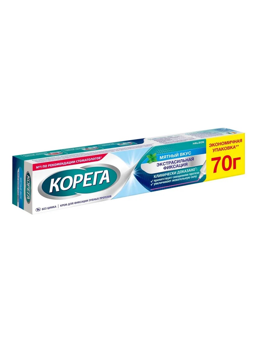 Надежная фиксация зубного протеза придаст вам уверенности и позволит заботиться о более важных вещах. Крем для фиксации зубных протезов Корега Экстра сильный мятный повышает качество жизни людей, использующих зубные протезы: предотвращает попадание частичек пищи под протез* за счет всесторонней фиксации; крем фиксирует зубной протез на целый день, позволяя вам забыть о дискомфорте в течение 12 часов**; освежает дыхание за счет ультрасвежего мятного вкуса, придавая дополнительное ощущение свежести во рту; не содержит цинк.* GSK Study L3920658, Tyson-Johnson, D., Shanga, G. and Fernandez, P.(2010) The use of soluble denture adhesive to prevent food from becoming trapped under fl upper and lower dentures, GSK.** Diamond, M.W. Efficacy study of a denture adhesive to reduce denture dislodgement while eating corn onthe cob or apples. 26-12-1990.