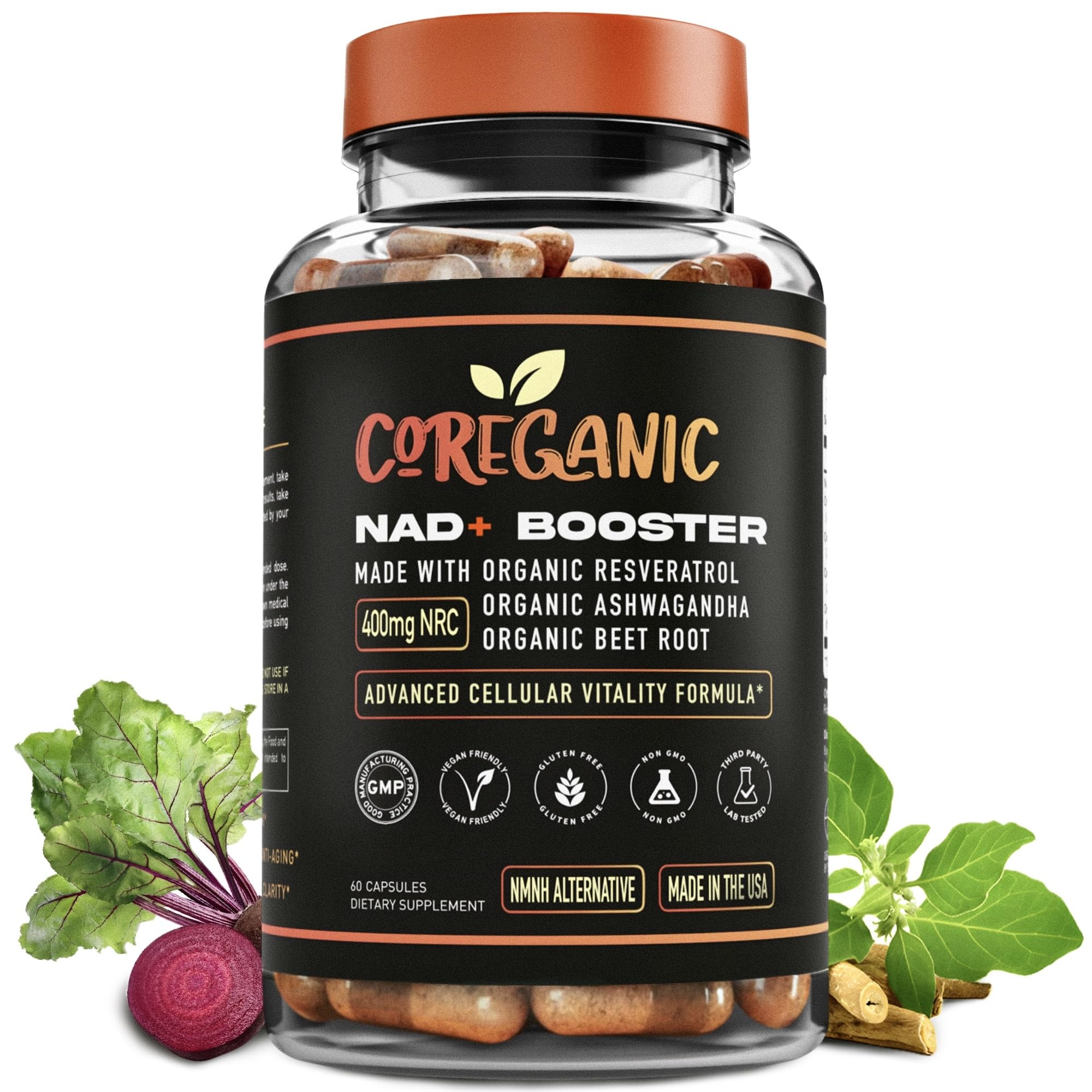 Coreganic Organic NAD+ Supplement 400mg NRC with Resveratrol Ashwagandha Beet Root & Black Pepper Cellular Energy Healthy Aging Brain Support & Vitality 60 Vegan Capsules