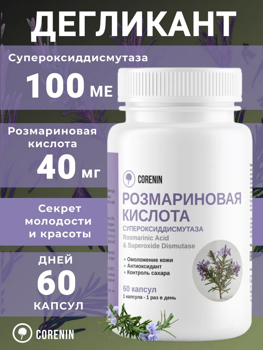 Представляем вам уникальную биологическую добавку, разработанную для защиты ваших клеток от негативного воздействия свободных радикалов и продуктов гликирования, а также для поддержания молодости кожи! Сочетание розмариновой кислоты и супероксиддисмутазы (СОД) обеспечивает комплексную защиту вашего организма.