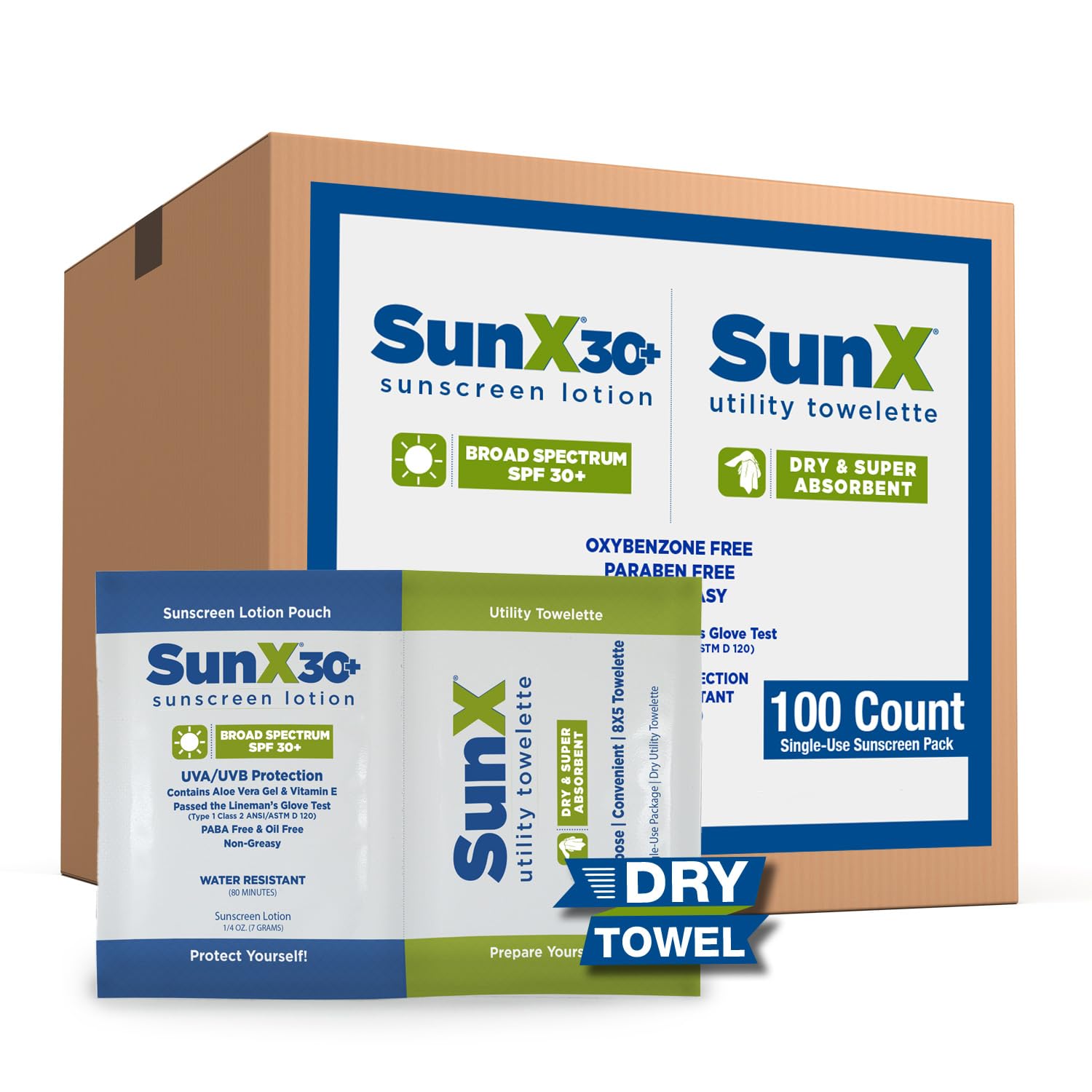 REEF SAFE - We are proud to say our PABA-free sunscreen lotion is formulated without the use of Parabens, Oxybenzone, and Octinoxate, allowing Sun X 30 Sunscreen to meet the requirements of Hawaii's "REEF Compliant" Act 104. 80-MINUTE WATER RESISTANCE - Our water-resistant sunscreen formula offers an 80-minute duration time, the longest allowed by the FDA. SPF 30 ON-THE-GO - Sun X packets of SPF 30 Broad Spectrum Sunscreen Lotion with Dry Towelettes are small, lightweight, and carefully sealed! Bring single-use packets of SPF 30 Sunscreen Dry Towel with you on your next outdoor activity. AMERICAN MANUFACTURER - Our entire line of Sun X 30 Sunscreen is Proudly Made in the USA. CONVENIENT DRY TOWELS INCLUDED - Each Sun X Sunscreen Lotion Packet is paired with a dry towelette, guaranteeing a mess-free sunscreen application.