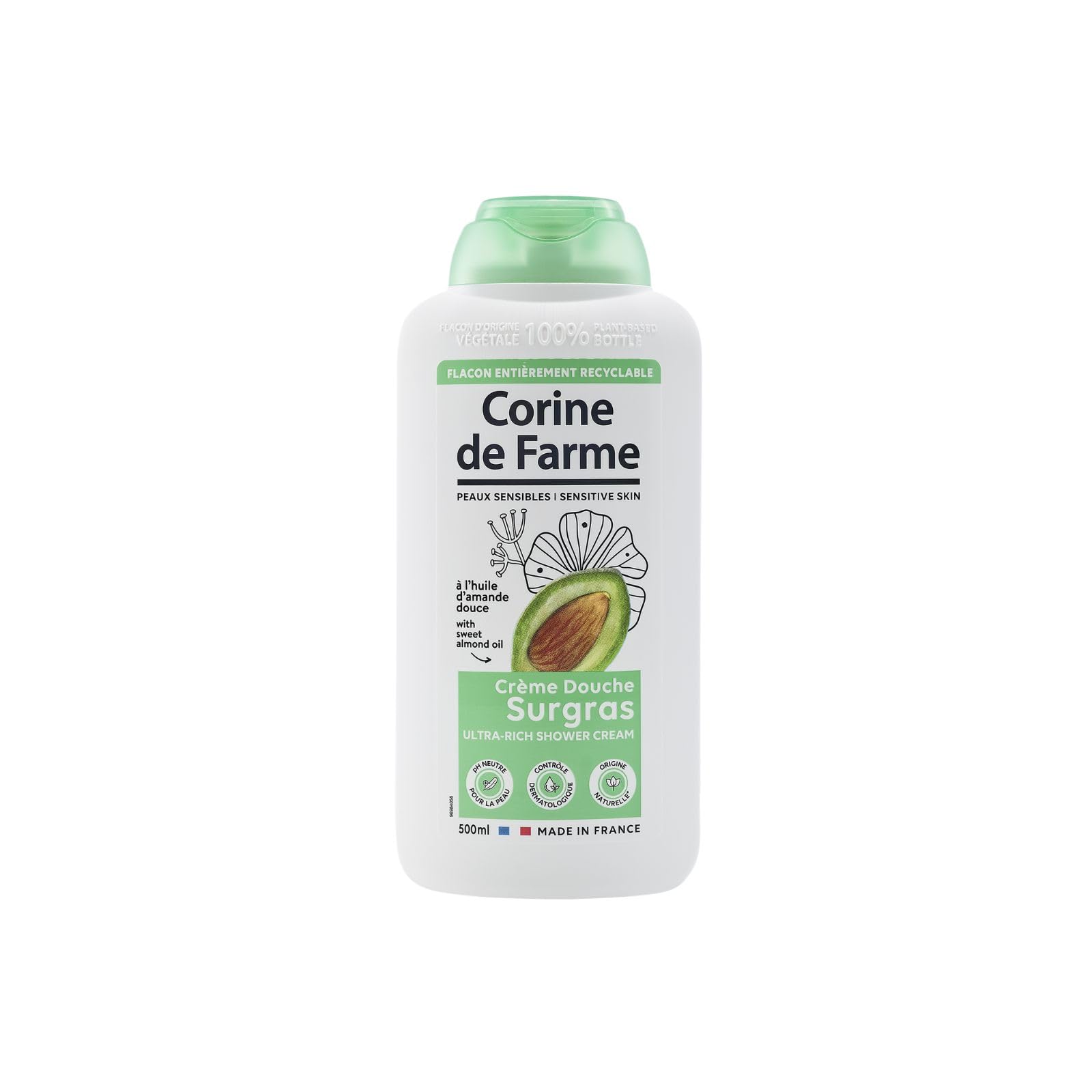 Corine de Farme, Nature at the service of delicate skin! Our brand is dedicated to caring for babies, mothers, and women worldwide, using all its expertise to bring them softness and beauty. Corine de Farme's mission is to help you care for yourself and your family with quality products you can trust. Our natural and certified organic skincare products are suitable for all skin types, even the most delicate. Use our super-rich shower cream from the Corine de Farme Natural range daily and let yourself be captivated by its delightful fragrance. The super-rich agents help fight against external aggressors and preserve the skin's protective barrier. They also provide softness, suppleness, and comfort. Our commitments are at the heart of everything we do: Corine de Farme is a company committed to Clean Beauty and eco-design. We are making progress step by step to improve our environmental footprint and human well-being, because we believe in continuous improvement. Caring for both skin and the planet is a true challenge that all our teams are delighted to take on. INGREDIENTS Aqua, Sodium Laureth Sulfate, Glycerin, Cocamidopropyl Betaine, Sodium Chloride, Parfum, Glycol Distearate, Glyceryl Oleate, Sodium Benzoate, Sorbitan Caprylate, Coco-Glucoside, Citric Acid, Potassium Sorbate, Sweet Almond Oil Polyglyceryl-4 Esters, Polyquaternium-4 Esters, Sodium Hydrofuge, Tocopherol, Hydrogenated Vegetable Glycerides Citrate SAFETY WARNING In case of contact with eyes, rinse thoroughly. Keep out of reach of children. See moreGuaranteed formulation, made in France: Designed, manufactured, and packaged in France under pharmaceutical control, this product has been dermatologically tested to guarantee safe use, even on sensitive skin. Directions for use: Place a generous amount of product in the palm of your hand, lather with water, gently massage all over your body, and rinse thoroughly with water. pH neutral: This rich shower cream is ideal for all skin types, even the most delicate and reactive, thanks to its neutral pH. Its light lather with gourmand notes leaves skin soft. Ultra-sensory, allergen-free fragrance: This cleansing product contains sweet almond oil. Its formula is composed of 90 carefully selected natural ingredients. Creamy and nourishing showers, enriched with vegetable glycerin: This super-rich shower cream gently cleanses without drying out even the most sensitive skin. Skin is moisturized, intensely nourished, and enveloped in a protective veil.Corine de Farme - Crème douche super grasse à l'huile d'amande douce - pH neutre - Origine naturelle - Contrôle dermatologique - Fabrication française - 500 mlDESCRIPTION DU PRODUIT DESCRIPTION DU PRODUIT Corine de Farme, La nature au service des peaux délicates ! Notre marque se consacre à prendre soin des bébés, des mères et des femmes du monde entier avec tout son savoir-faire pour leur apporter douceur et beauté. La mission de Corine de Farme est de vous aider à prendre soin de vous et de votre famille avec des produits de qualité sur lesquels vous pouvez avoir confiance. Nos produits de soins de la peau, naturels et certifiés bio, conviennent à tous les types de peau, même les plus délicates. Utilisez quotidiennement notre crème douche super grasse de la gamme Corine de Farme Natural et laissez-vous envoûter par son délicieux parfum. Les agents supergras aident à lutter contre les agressions extérieures et à préserver le film protecteur de la peau. En outre, ils apportent douceur, souplesse et confort à la peau. Nos engagements sont au cœur de nos préoccupations : Corine de Farme, une entreprise engagée dans la Clean Beauty et l'éco-design. Nous progressons pas à pas pour améliorer notre empreinte écologique et le bien-être humain, car nous croyons au progrès continu. Prendre soin de la peau et de la planète est un véritable défi que toutes nos équipes sont ravis de relever. INGRÉDIENTS Aqua, Sodium Laureth Sulfate, Glycerin, Cocamidopropyl Betaine, Sodium Chloride, Parfum, Glycol Distearate, Glyceryl Oleate, Sodium Benzoate, Sorbitan Caprylate, Coco-Glucoside, Citric Acid, Potassium Sorbate, Sweet Almond Oil Polyglyceryl-4 Estters, Polyquaternium-4 esters. 7, Sodium Hydrofuge. xide, tocopherol, hydrogenated végétable glycerides citrate AVERTISSEMENT DE SÉCURITÉ En cas d'éclaboussures dans les yeux, rincer abondamment. Tenir hors de portée des enfants. Voir plusFormulation garantie, fabrication française : conçu, fabriqué et conditionné en France sous contrôle pharmaceutique, ce produit a été testé dermatologiquement pour garantir une utilisation sûre, même sur les peaux sensibles. Conseils d'utilisation : mettre une quantité généreuse de produit dans la paume de la main, faire mousser avec de l'eau, masser doucement sur tout le corps et rincer abondamment à l'eau. pH neutre : la crème douche surgras est idéale pour tous les types de peau, même les plus délicates et réactives, grâce à son pH neutre. Sa mousse légère aux notes gourmandes laisse la peau douce. Parfum ultrasensoriel sans allergènes : ce produit nettoyant contient de l'huile d'amande douce. Sa formule est composée de 90 d'ingrédients d'origine naturelle sélectionnés avec grand soin. Douches crémeuses et nourrissantes, enrichies en glycérine végétale : la crème douche super grasse nettoie en douceur sans dessécher même les peaux les plus sensibles. La peau est hydratée, intensément nourrie et enveloppée d'un voile protecteur.